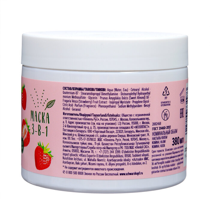 | Состав | Aqua (Water, Eau) · Cetearyl Alcohol · Quaternium-87 · Stearamidopropyl Dimethylamine · Distearoylethyl Hydroxyethylmonium Methosulfate · Glycerin · Prunus Amygdalus Dulcis (Sweet Almond) Oil · Fragaria Vesca (Strawberry) Fruit Extract · Isopropyl Myristate · Propylene Glycol · Citric Acid · Parfum (Fragrance) · Phenoxyethanol · Sodium Methylparaben · Benzyl Alcohol · Geraniol. |