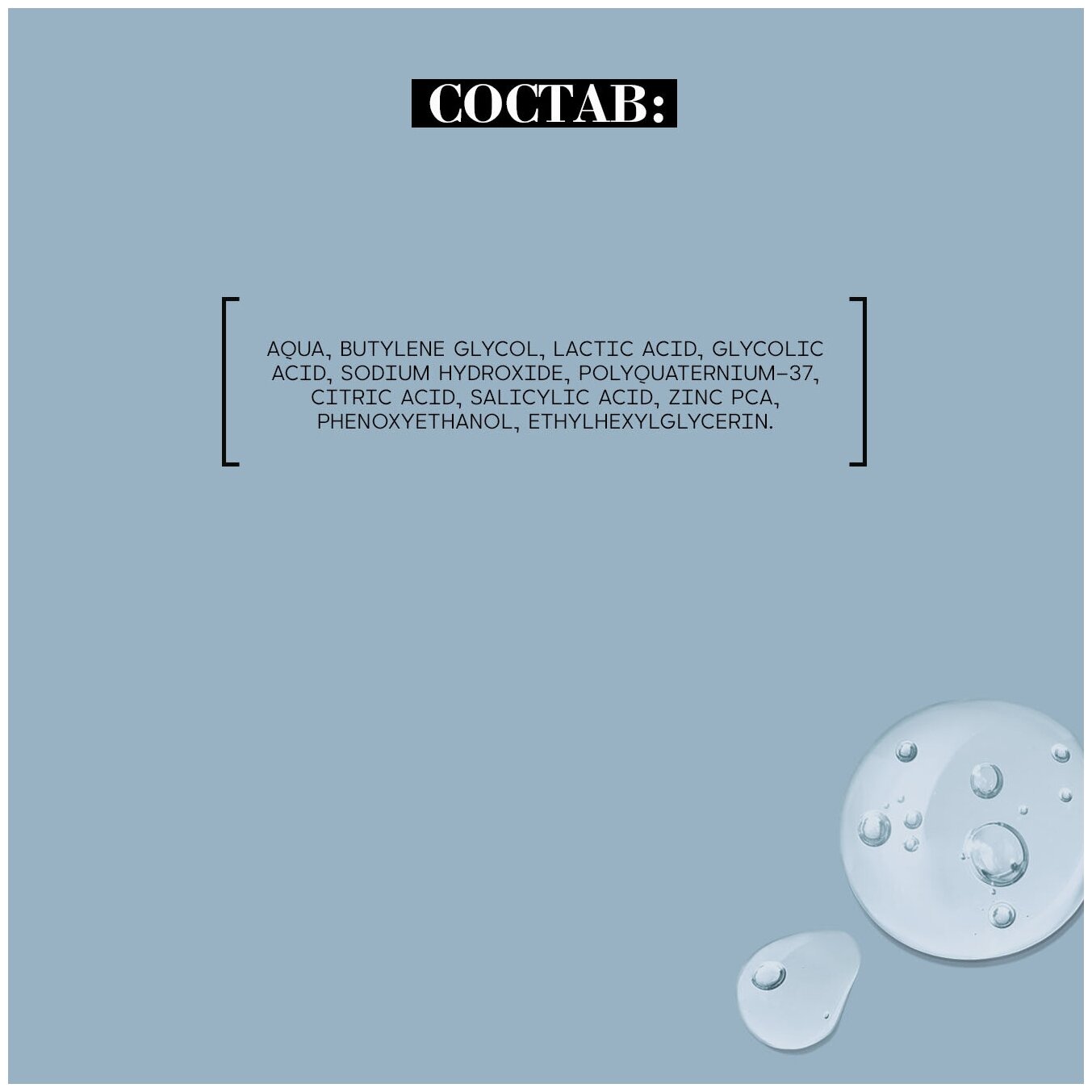 | Состав | aqua, butylene glycol, lactic acid, glycolic acid, sodium hydroxide, polyquaternium-37, citric acid, salicylic acid, zinc pca, phenoxyethanol, ethylhexylglycerin |