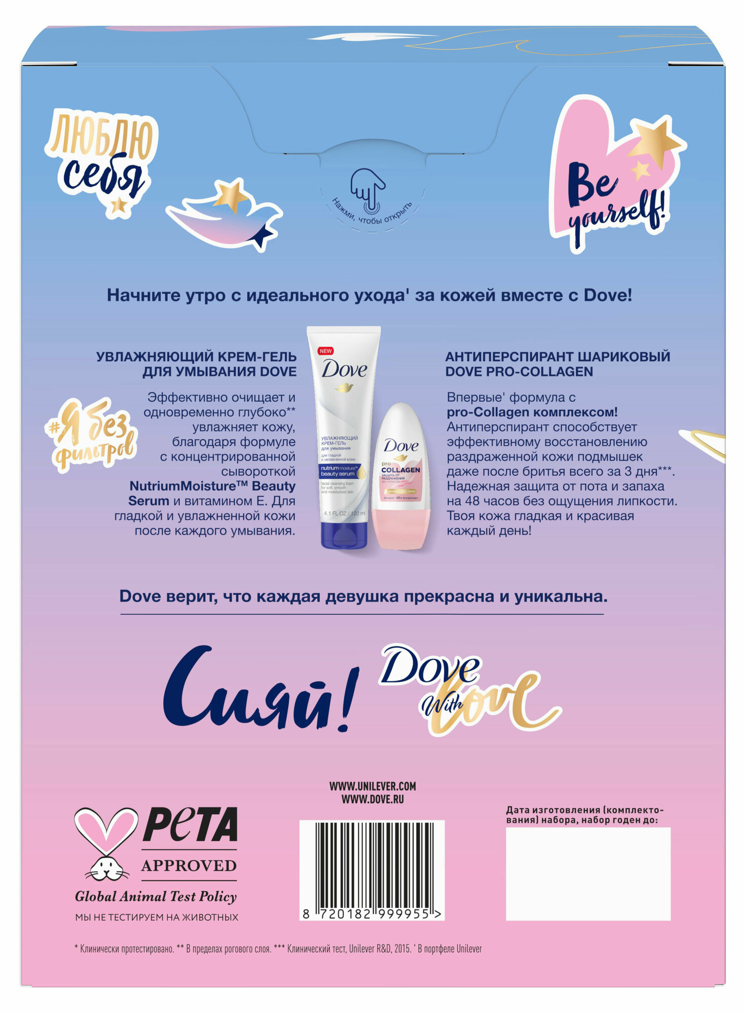| Состав набора | шариковый антиперспирант Dove Pro-collagen 50 мл; увлажняющий крем-гель для умывания 120 мл |