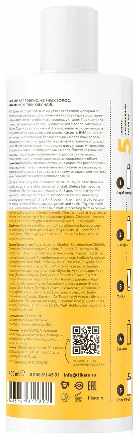 Бальзам-Кондиционер для волос Likato Wellness для тонких жирных волос 400мл Космо Бьюти