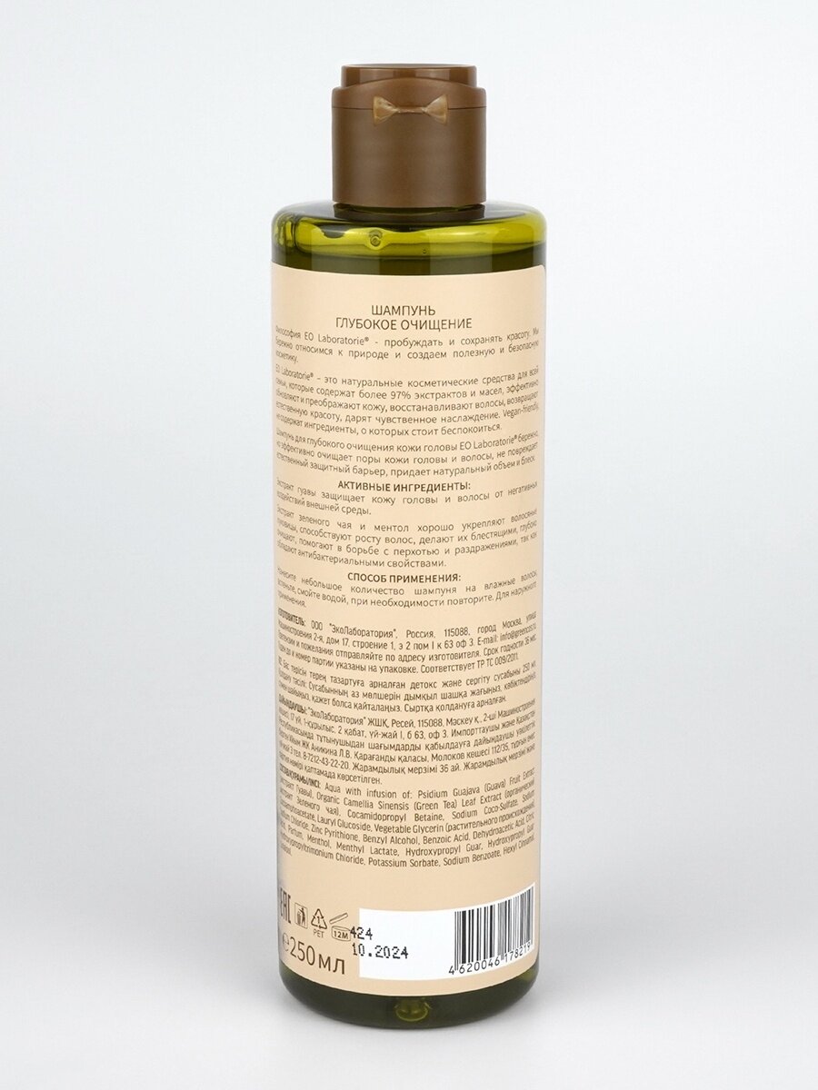 Шампунь для глубокого очищения кожи головы EO Laboratorie бережно, но глубоко очищает волосы, не повреждает естественный защитный барьер кожи головы и волос, придает натуральный объем и естественный блеск. Экстракт гуавы защищает кожу головы и волосы от внешних воздействий окружающей среды. Экстракт зеленого чая и ментола хорошо укрепляют волосяные луковицы, способствуют их росту и разглаживанию чешуек волоса, делают их блестящими, помогают в борьбе с перхотью и раздражениями, так как обладают антибактериальными свойствами.