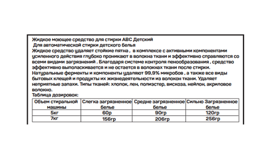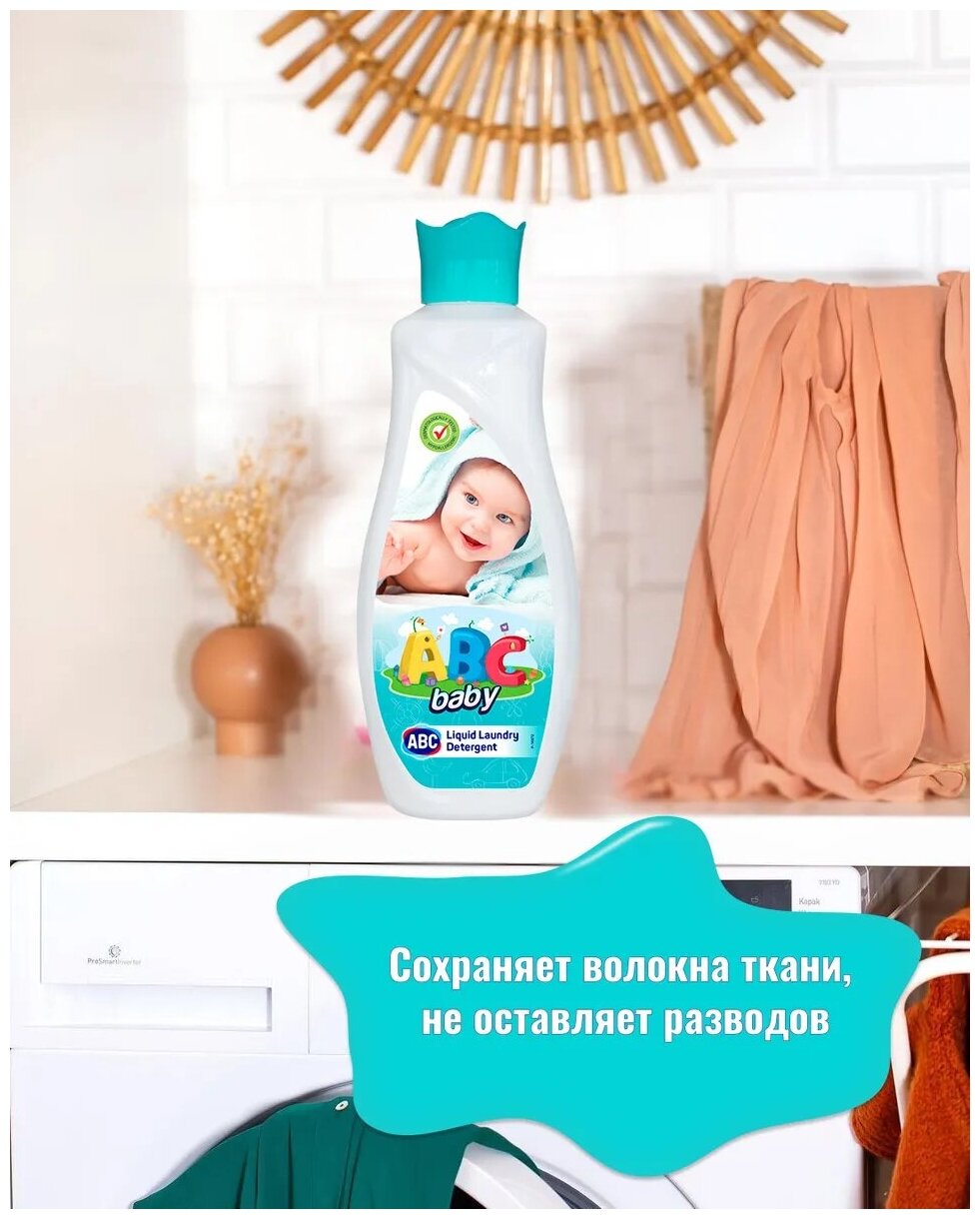 Жидкое моющее средство АВС для стирки детского белья. Для автоматической стирки детского белья Жидкое средство удаляет стойкие пятна, в комплексе с активными компонентами усиленного действия глубоко проникают в волокна ткани и эффективно справляются со всеми видами загрязнений. Благодаря системе контроля пенообразования, средство эффективно выполаскивается и не остается в волокнах ткани после стирки. Натуральные ферменты и компоненты удаляют 99,9% микробов, а также все виды бытовых клещей и продукты их жизнедеятельности из волокон ткани. Удаляет неприятные запахи. Типы тканей: хлопок, лен, полиэстер, вискоза, нейлон, акриловое волокно.