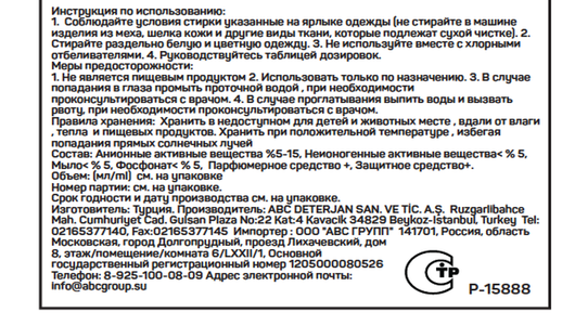 | Химический состав | Анионные активные вещества 5-15%, неионогенные вещества менее 5%, мыло менее 5%, фосфонат менее 5%, парфюмерное средство, защитное средство, энзим. |