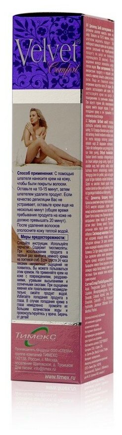 | Способ применения | С помощью шпателя нанесите крем на кожу, чтобы были покрыты волоски. Оставьте на 10-15 минут, затем шпателем удалите продукт. Если качество депиляции Вас не устраивает, оставьте крем ещё на несколько минут (общее время пребывания продукта на коже не должно превышать 20 минут). После удаления волосков ополосните кожу тёплой водой. Завершите процедуру с помощью средств после депиляции Velvet, которые помогут коже восстановить свои естественные защитные свойства. |
