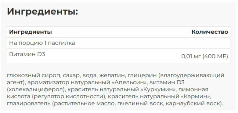 | Состав | глюкозный сироп, сахар, вода, желатин, глицерин (влагоудерживающий агент), ароматизатор натуральный «Апельсин», витамин D3 (холекальциферол), краситель натуральный «Куркумин», лимонная кислота (регулятор кислотности), краситель натуральный «Кармин», глазирователь (растительное масло, пчелиный воск, карнаубский воск) |