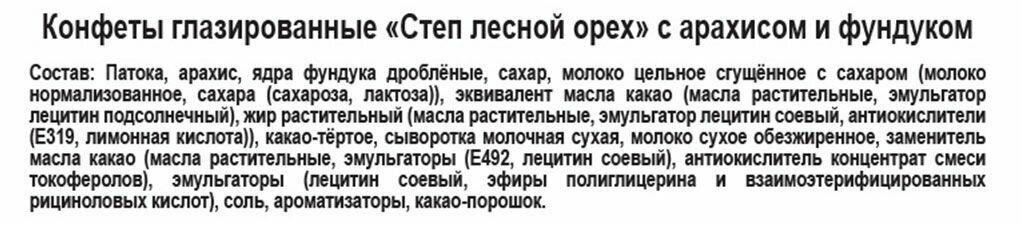 | Состав | патока; арахис; сахар; молоко цельное сгущенное с сахаром (молоко цельное; молоко обезжиренное; сахара (сахароза; лактоза)); эквивалент масла какао (масла растительные; эмульгатор лецитин соевый; антиокислители (е306; кислота лимонная)); жир растительный (масла растительные; антиокислители (е319; кислота лимонная)); ядра фундука дробленые; сыворотка молочная сухая; какао - тертое; заменитель масла какао (масла растительные; эмульгаторы (е492; лецитин соевый); антиокислитель е306); эмульгаторы (лецитин соевый; е476); соль; ароматизаторы; молоко сухое обезжиренное; какао-порошок |