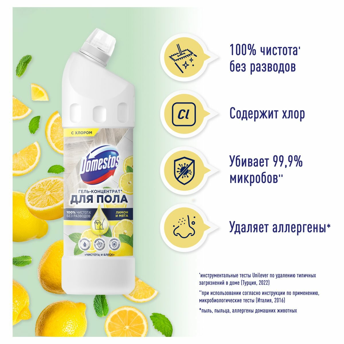Концентрированное моющее средство Domestos Лимон и мята - гель для мытья пола и других поверхностей. Он очищает от загрязнений, возвращает блеск и дарит приятный аромат. Оказывает противомикробное действие, уничтожая до 99,99% бактерий.