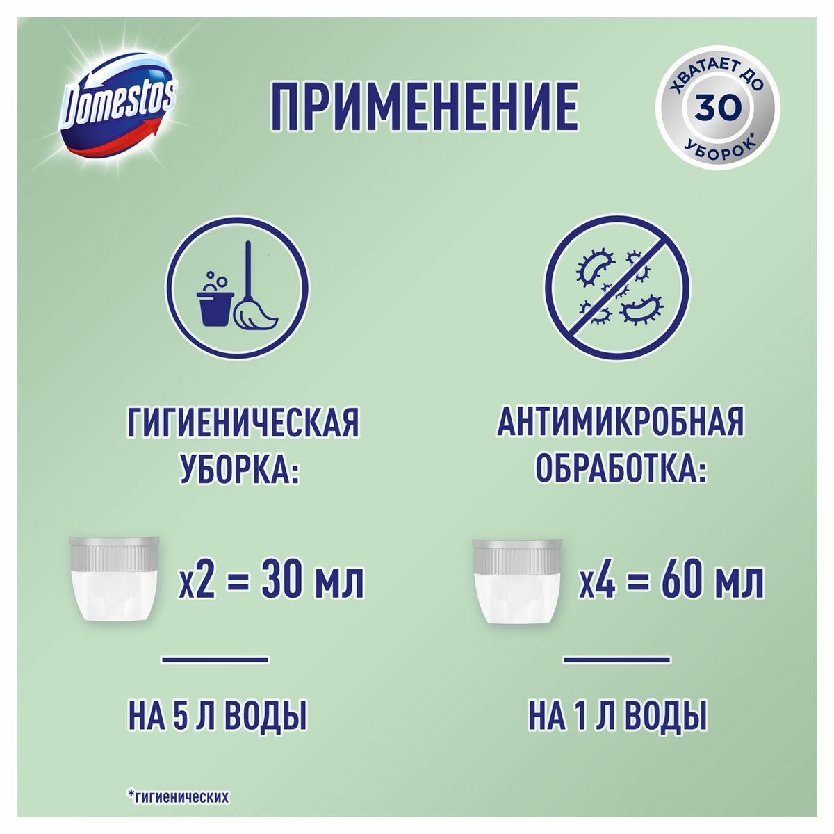 | Способ применения | Для регулярной гигиенической уборки разведите 2 колпачка средства (30мл) в 5 литрах воды. Вымойте полы, протрите поверхности как обычно. Не нужно смывать. Для антимикробной обработки пола и рабочих поверхностей разведите средство из расчета 4 колпачка (60мл) на 1 литр воды. Не нужно смывать. |