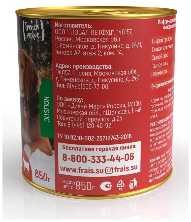 Glogin Frais консервированный полнорационный корм для собак класса Холистик. Сочные кусочки мяса в желе с говядиной. Состав: мясо и мясные субпродукты в кусочках - 70% (в том числе говядина минимум 15%), витамины (А, витамины группы В, D3, Е, РР), минеральные вещества (фосфор, кальций, натрий, калий, магний, марганец, цинк, медь, йод), пищевой коллаген. Добавленные вещества: витамины (витамин А - 2000 МЕ/кг, витамин D3 - 90 МЕ/кг, витамин Е - 15 мг/кг). Пищевая ценность в 100 г продукта (средние значения белки - 8%; жиры - 5,5 %; сырая клетчатка - 0,3%; сырая зола - 1,6%; влажность - 82%; фосфор - 0,2 мг; кальций - 0,32 г. Энергетическая ценность (калорийность) - 86 ккал.РЕКОМЕНДАЦИИ ПО КОРМЛЕНИЮ: для взрослой собаки суточная норма корма в день примерно 60-70 г на 1 кг массы. Данные рекомендации являются приблизительными. Индивидуальные суточные потребности зависят от разных факторов, таких как возраст, порода и активность. Предоставьте животному достаточное количество питьевой воды. Хранить при температуре от 0 °С до +35 °С и относительной влажности воздуха не более 75%. После вскрытия упаковки продукт следует хранить в холодильнике не более 24 часов при температуре от +2°С до +6°С. Срок годности: 2 года с даты изготовления.