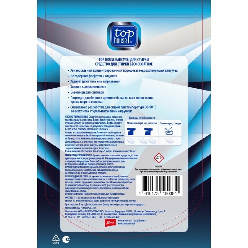 Капсулы для стирки Top House – это современное концентрированное средство для стирки, придающее безупречный вид вашей одежде.Одна капсула содержит необходимую для максимально эффективной стирки дозу лучшего средства для чистоты вашего белого и цветного белья. Также подходит для стирки детской одежды. Стиральный порошок/капсулы для стирки безопасен для септиков.Благодаря уникальным технологиям и природным энзимам в составе, капсулы для стирки Top House прекрасно отстирывает сложные пятна даже при температуре 30°C. Не содержат фосфатов, без запаха. В отличие от других стиральных средств, таких как гель для стирки и порошок для стирки, капсулы просто использовать: продуманная дозировка – просто положить капсулу в сухой барабан стиральной машины перед началом стирки.