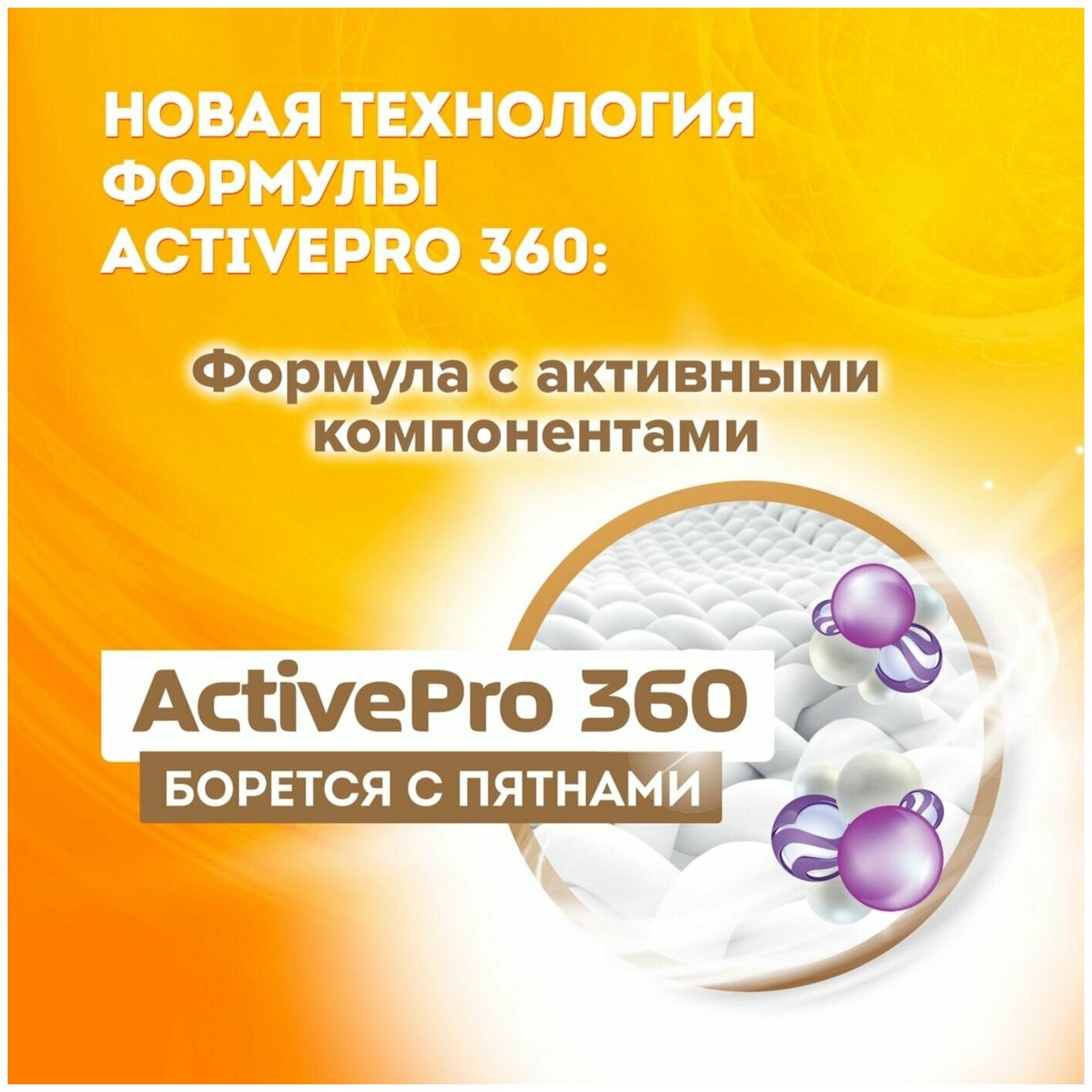 Благодаря формуле ActivePro 360 гель придает белью и вещам приятную свежесть и эффективно борется с пятнами. Формула без добавления фосфатов.