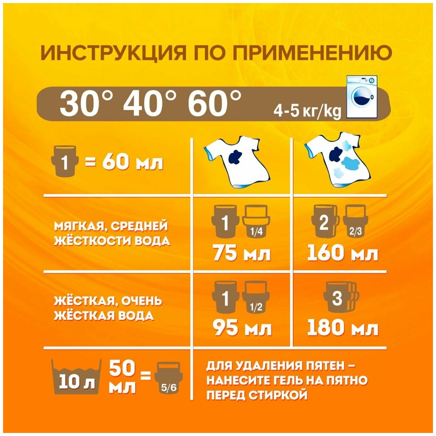 | Способ применения | Залейте гель в отсек для моющих средств, запустите программу стирки. Следуйте рекомендациям, указанным на ярлычках изделий. |