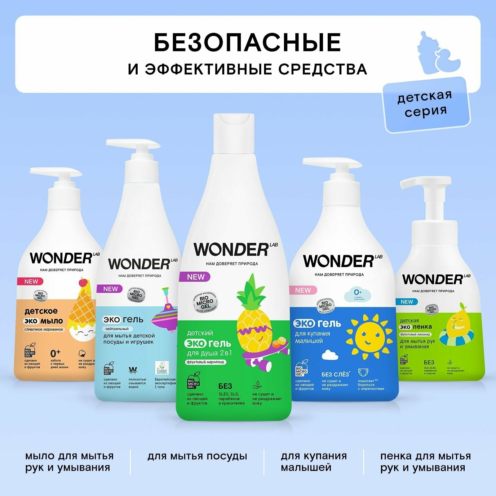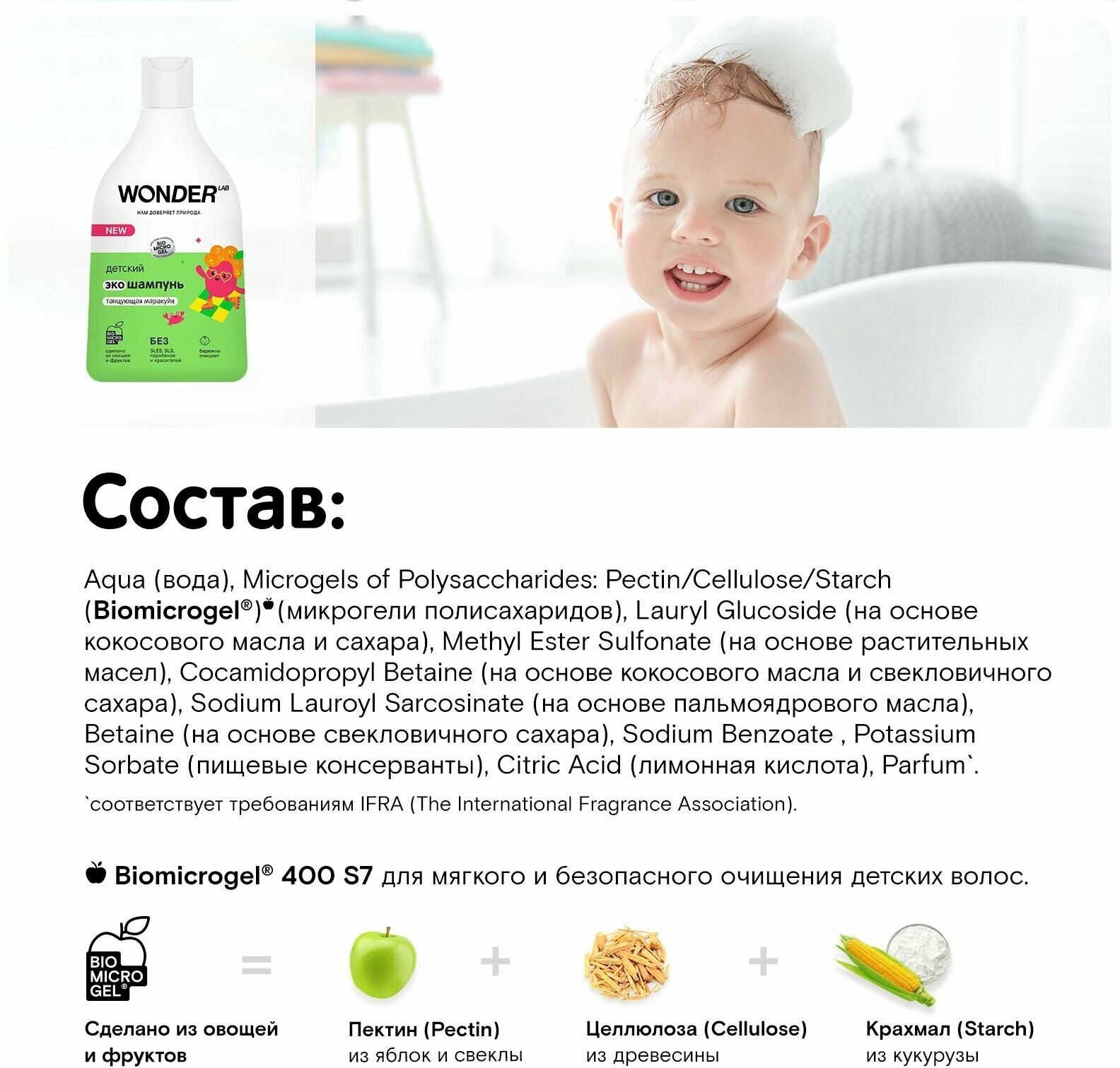 Детский шампунь 0+ WONDER LAB превратит купание вашего малыша в вечеринку с ароматом сочных и сладких ягод. Яркий дизайн привлечет внимание малыша, а мягкая формула без слез поможет без неприятных впечатлений сформировать привычку мыть голову. Мягкая пенка экошампуня бережно очищает волосы и кожу головы, а безопасный состав без SLS, SLES, парабенов и красителей подходит с первых дней жизни и не вызовет аллергии. Подходит для ежедневного использования. После купания волосы малыша мягкие и блестящие, без шелушения кожи и других неприятных ощущений. В основе шампуня для малышей - инновационный компонент Biomicrogel, который сделан из овощей и фруктов. Благодаря этому компоненту, средства WONDER LAB безопасны для человека, не вредят окружающей среде, не содержат токсичных компонентов и разлагаются на 98% за 1 день.