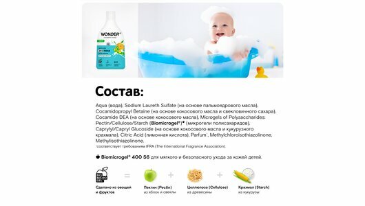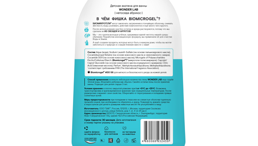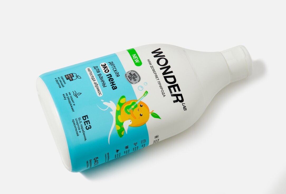 Мягкая пена с ароматом нежного абрикоса станет настоящим удовольствием, будет вызывать только приятные ассоциации и поможет сформировать полезную привычку. Средство для купания не сушит и не раздражает нежную детскую кожу, не вызывает шелушение. Полностью смывается водой и не оставляет на коже липкой пленки. Полностью безопасный состав: без SLS, парабенов, спиртов и красителей. В основе детского средства - инновационный компонент Biomicrogel, который сделан из овощей и фруктов. Благодаря этому компоненту, средства WONDER LAB безопасны для человека, не вредят окружающей среде, не содержат токсичных компонентов и разлагаются на 98% за 1 день.
