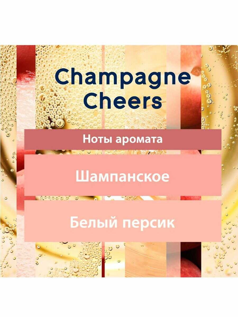 CHAMPAGNE CHEERS. Ноты шампанского и белого персика. Группа аромата: гурман и восточные. Искрящийся и праздничный аромат шампанского с нотками белого персика в сочетании с соком личи, цитрусовыми и сливочным мускусом.