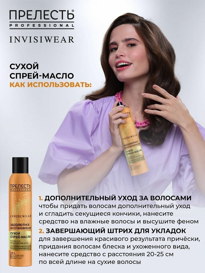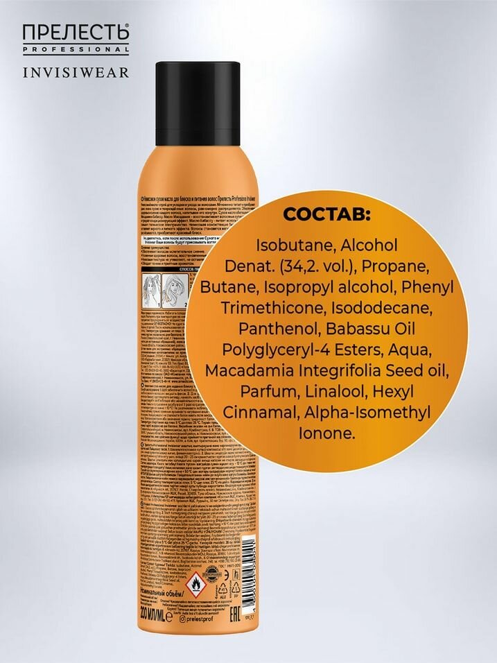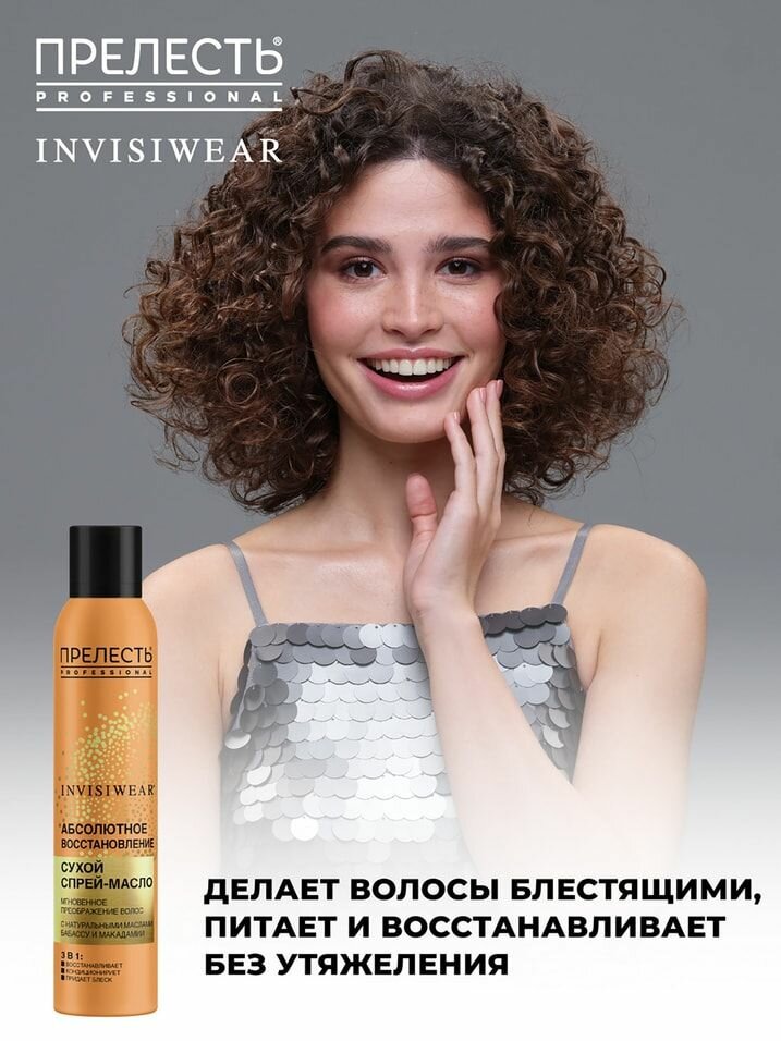 Масло сухое для волос Прелесть Professional Invisiwear Невесомое для блеска и питания волос 200мл Аэрозоль Новомосковск