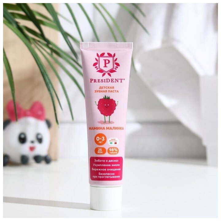 Детская зубная паста PRESIDENT Мамина малинка от 0 до 3 лет обеспечивает заботу о деснах, укрепление эмали и бережное очищение. Безопасно при проглатывании! Гелевая форма зубной пасты облегчает очищение в труднодоступных местах. Эффективность клинически доказана. Одобрено детскими стоматологами. Биодоступный кальций способствует интенсивной реминерализации, укрепляя эмаль молочных и постоянных зубов. Календула снижает риск воспаления. Ксилитол 12% подавляет рост бактерий и сокращает образование зубного налета. Не содержит: фторидов, агрессивных абразивов, сульфатов, сахара, синтетических красителей и ароматизаторов. Биодоступные растительные компоненты. Контролируемая абразивность (RDA 25) обеспечивает деликатное очищение хрупкой эмали. RDA это СТРОГИЙ КОНТРОЛЬ за размером и концентрацией абразивных частиц. Специально подобранный абразив БЕЗОПАСНО и ЭФФЕКТИВНО удаляет налёт, ОЧИЩАЕТ и ПОЛИРУЕТ зубную эмаль.