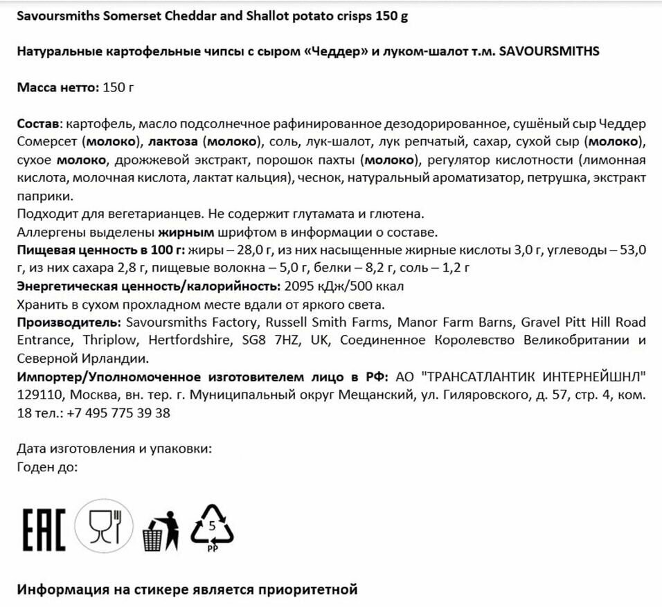 | Состав | Картофель, масло подсолнечное рафинированное дезодорированное, сушёный сыр Чеддер Сомерсет (молоко), лактоза (молоко), соль, лук-шалот, лук репчатый, сахар, сухой сыр (молоко), сухое молоко, дрожжевой экстракт, порошок пахты (молоко), регулятор кислотности (лимонная кислота, молочная кислота, лактат кальция), чеснок, натуральный ароматизатор, петрушка, экстракт паприки. |