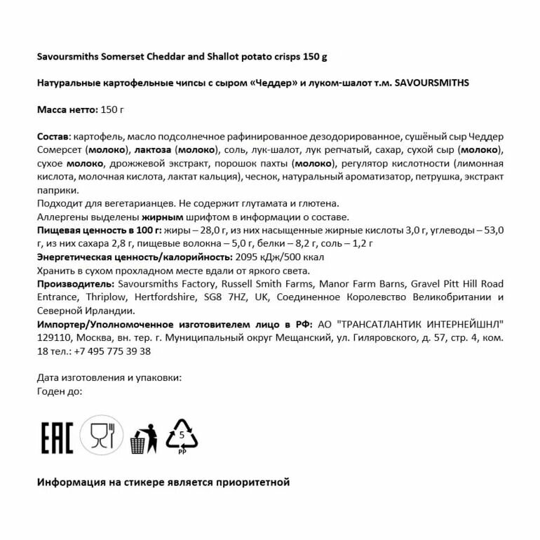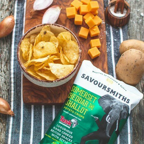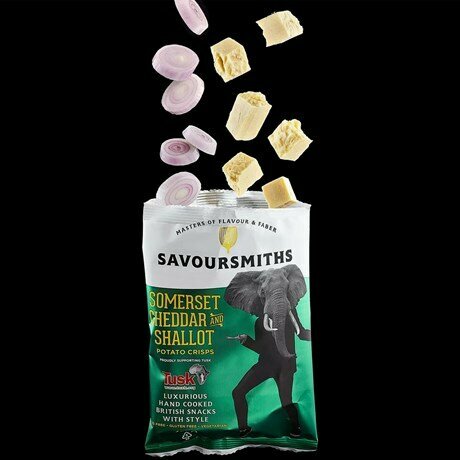 SAVOURSMITHS - супер-премиальный бренд натуральных картофельных чипсов из Англии. Мы выпускаем хрустящие и нежные картофельные чипсы cуникальными яркими вкусами. Наш продукт - это нечто особенное для ценителей качественных снеков – роскошные картофельные чипсы Savoursmiths. Они сделаны вручную из лучших сортов картофеля, выращенного на нашей семейной ферме в Кембриджшире на востоке Англии. Наш подход - от фермы напрямую к потребителю! Мы создаем продукты с исключительно приятным вкусом и оставляем кожицу на картофеле для сохранения важных питательных веществ и питательной ценности продукта. Чипсы SAVOURSMITHS нарезается из британского картофеля, собранного вручную, и готовятся вручную небольшими партиями. Мы уделяем пристальное внимание методам выращивания картофеля и отбираем только высококачественные ингредиенты, в результате получается более здоровый продукт превосходного качества. Весь ассортимент наших чипсов состоит только из натуральных ингредиентов и натуральных ароматизаторов и не содержит глютена и глутамата натрия. Ассортимент наших чипсов включает в себя семь уникальных вкусов, в составе каждого их них - лучшие ингредиенты со всего мира. Яркая, премиальная упаковка с изображением уникальных персонажей привлекает внимание к продукту с первого взгляда, выгодно выделяет наши чипсы среди конкурентов. Уникальные свойства наших чипсов: - Уникальные вкусы и ингредиенты выгодно отличают нас от конкурентов - Только натуральные ингредиенты - Картофель, выращенный на семейной ферме - Наш подход - от фермы напрямую к потребителю - Яркая, премиальная упаковка, пригодная для вторичной переработки - Подходит для вегетарианцев - Без глютена - Не содержит глутамат натрия В ассортименте SAVOURSMIT В ассортименте SAVOURSMITHS представлены 7 восхитительных вкусов со всего мира, которые пощекочут вкусовые рецепторы, расширят вкусовые горизонты, подарят уникальные вкусовые ощущения. С сыром «Чеддер» и луком-шалот. Тающий во рту сыр чеддер из графства Сомерсет сочетается с нежной сладостью лука-шалота, придавая хрустящим чипсам не только вкус, но и насыщенность.