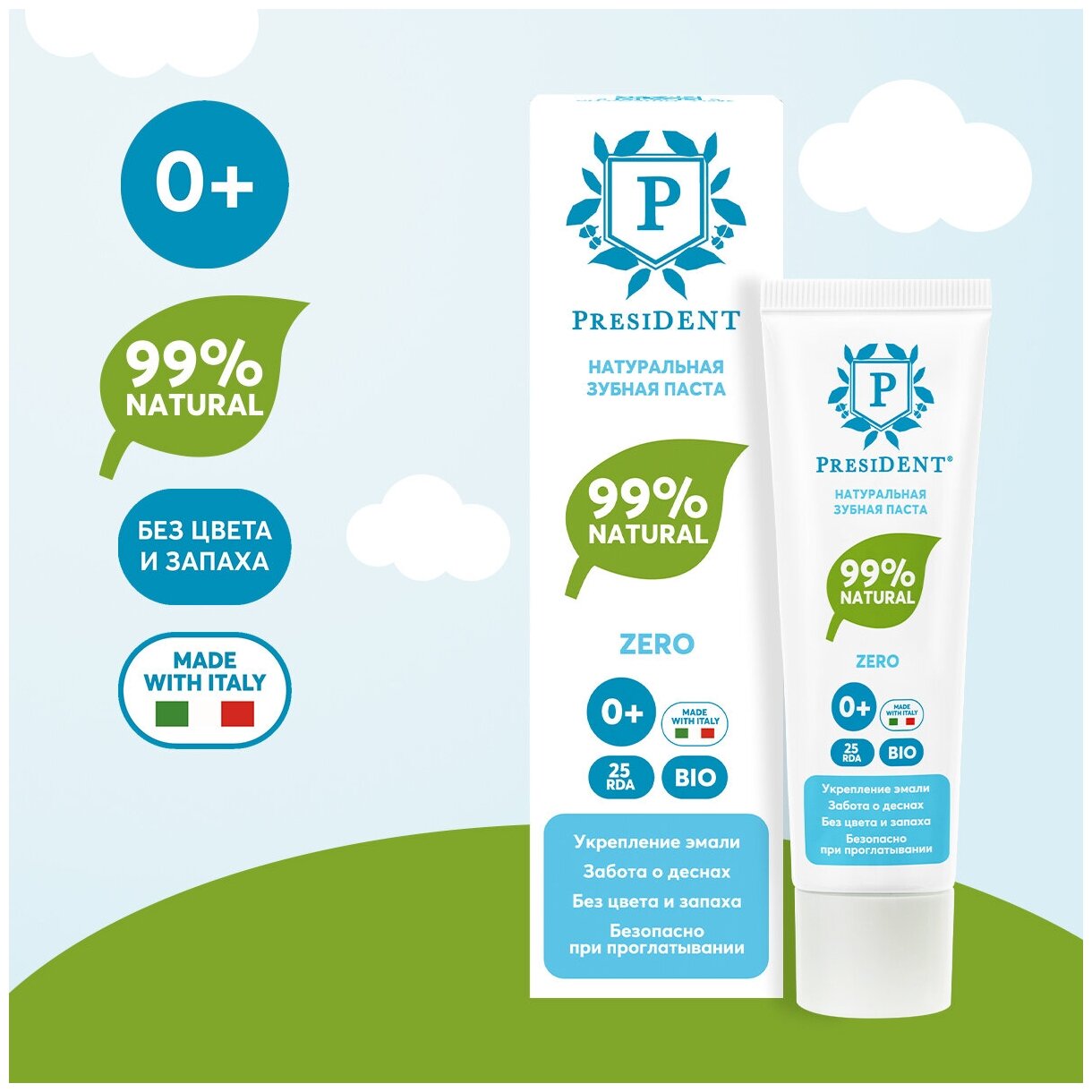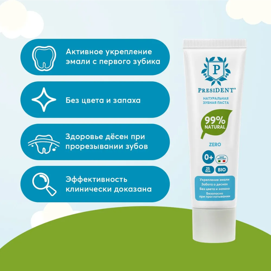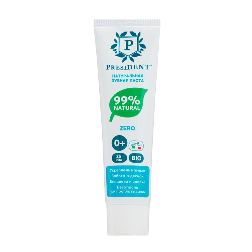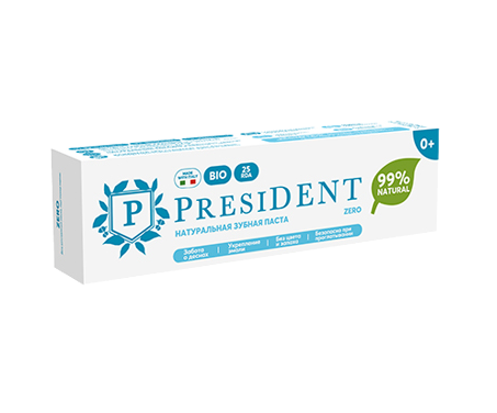 Натуральная зубная паста PRESIDENT Zero 0+ обеспечивает заботу о деснах и укрепление эмали. Зубная паста без цвета и запаха.