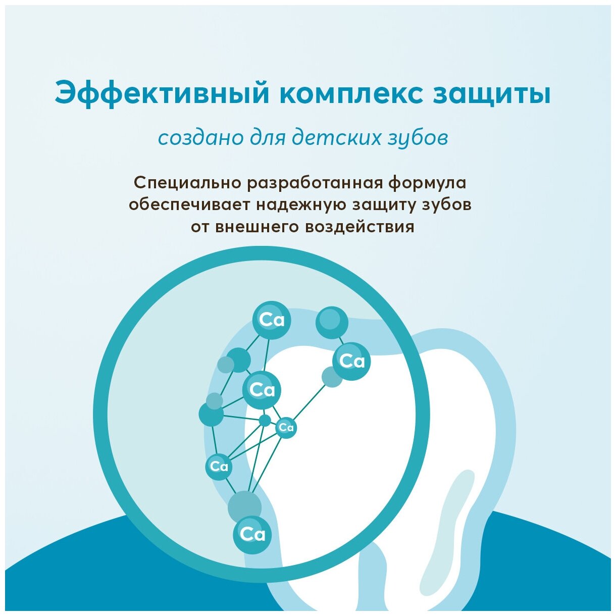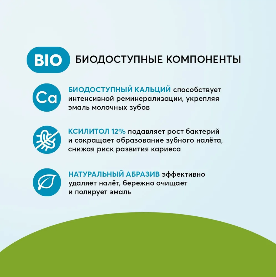 •Биодоступный кальций способствует интенсивной реминерализации, укрепляя эмаль молочных и постоянных зубов