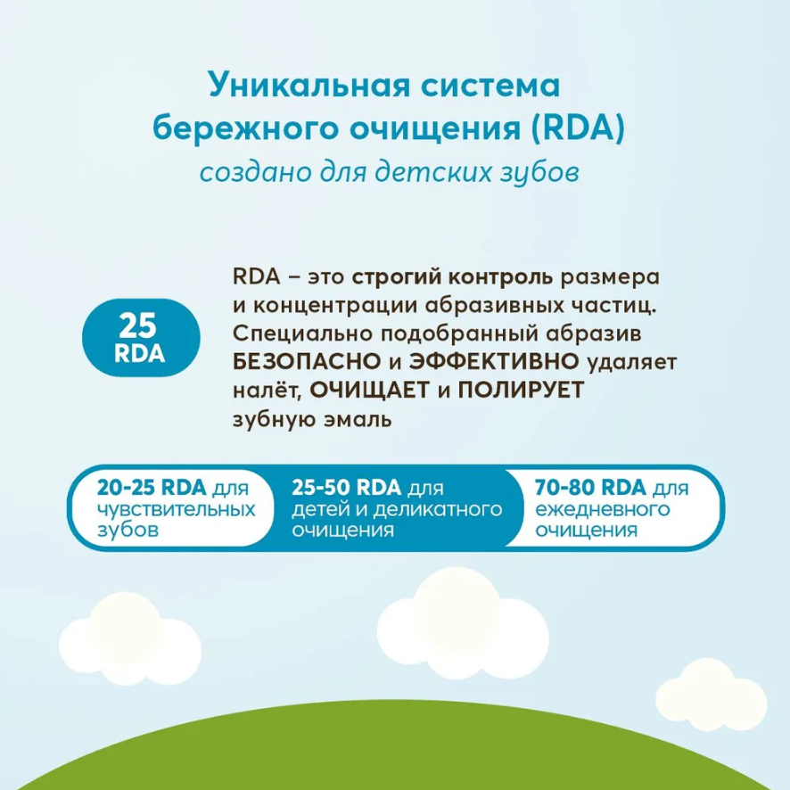 RDA – это строгий контроль за размером и концентрацией абразивных частиц. Специально подобранный абразив безопасно и эффективно удаляет налёт, очищает и полирует зубную эмаль.