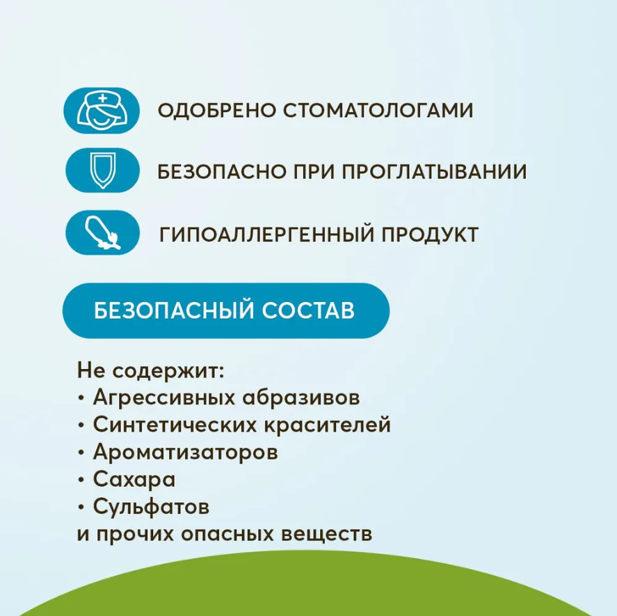НЕ содержит: фторидов, агрессивных абразивов, сульфатов, сахара, синтетических красителей и ароматизаторов