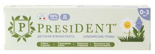 Детская зубная паста PRESIDENT Альпийские травы от 0 до 3 лет обеспечивает заботу о деснах, укрепление эмали и бережное очищение. Безопасно при проглатывании! Гелевая форма зубной пасты облегчает очищение в труднодоступных местах. Эффективность клинически доказана. Одобрено детскими стоматологами. Биодоступный кальций способствует интенсивной реминерализации, укрепляя эмаль молочных и постоянных зубов. Календула снижает риск воспаления. Ксилитол 12% подавляет рост бактерий и сокращает образование зубного налета. Не содержит: фторидов, агрессивных абразивов, сульфатов, сахара, синтетических красителей и ароматизаторов. Биодоступные растительные компоненты. Контролируемая абразивность (RDA 25) обеспечивает деликатное очищение хрупкой эмали. RDA это СТРОГИЙ КОНТРОЛЬ за размером и концентрацией абразивных частиц. Специально подобранный абразив БЕЗОПАСНО и ЭФФЕКТИВНО удаляет налёт, ОЧИЩАЕТ и ПОЛИРУЕТ зубную эмаль.
