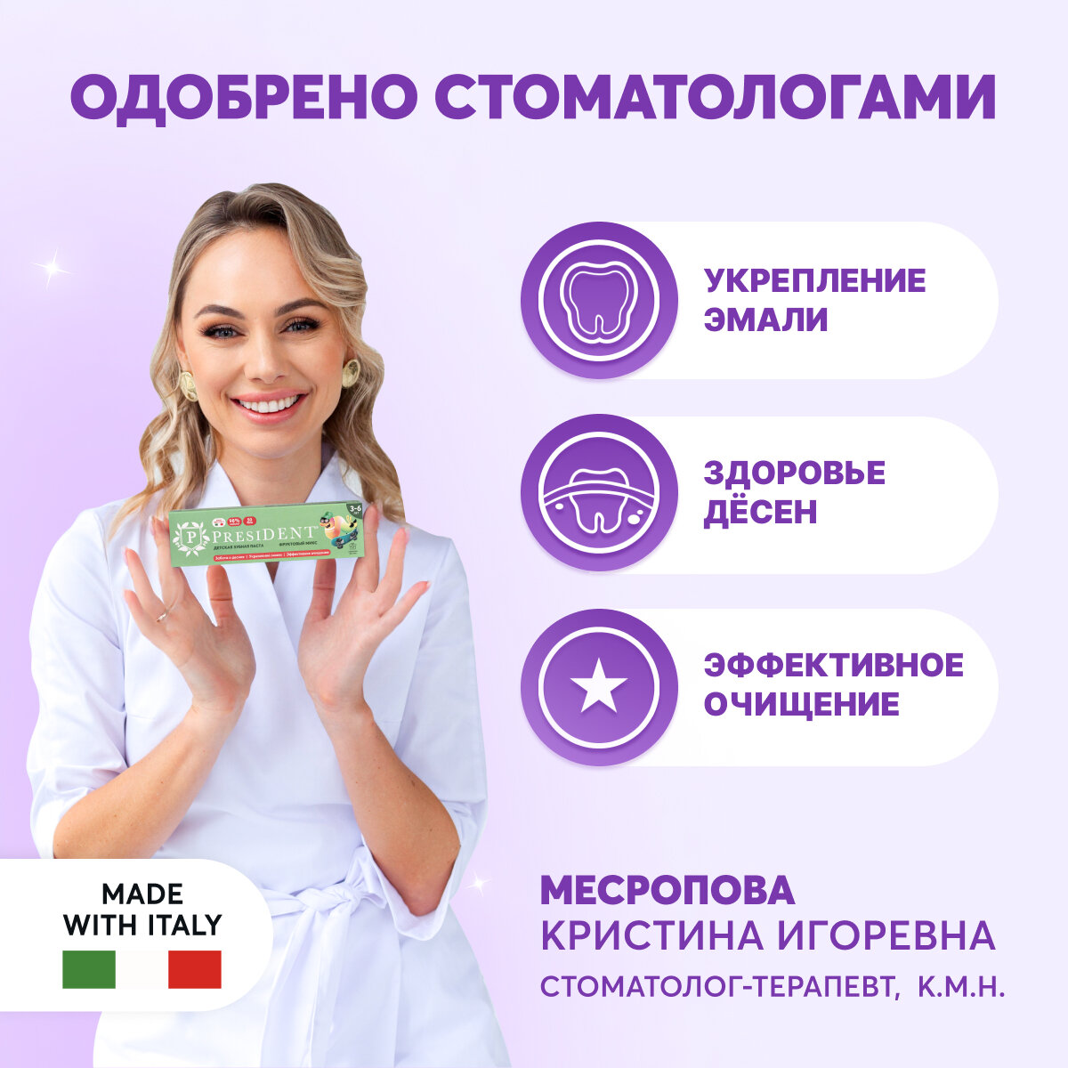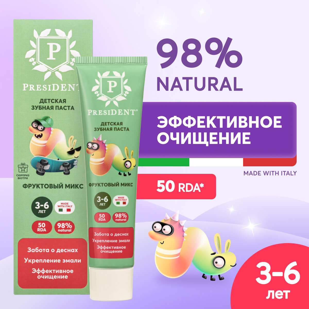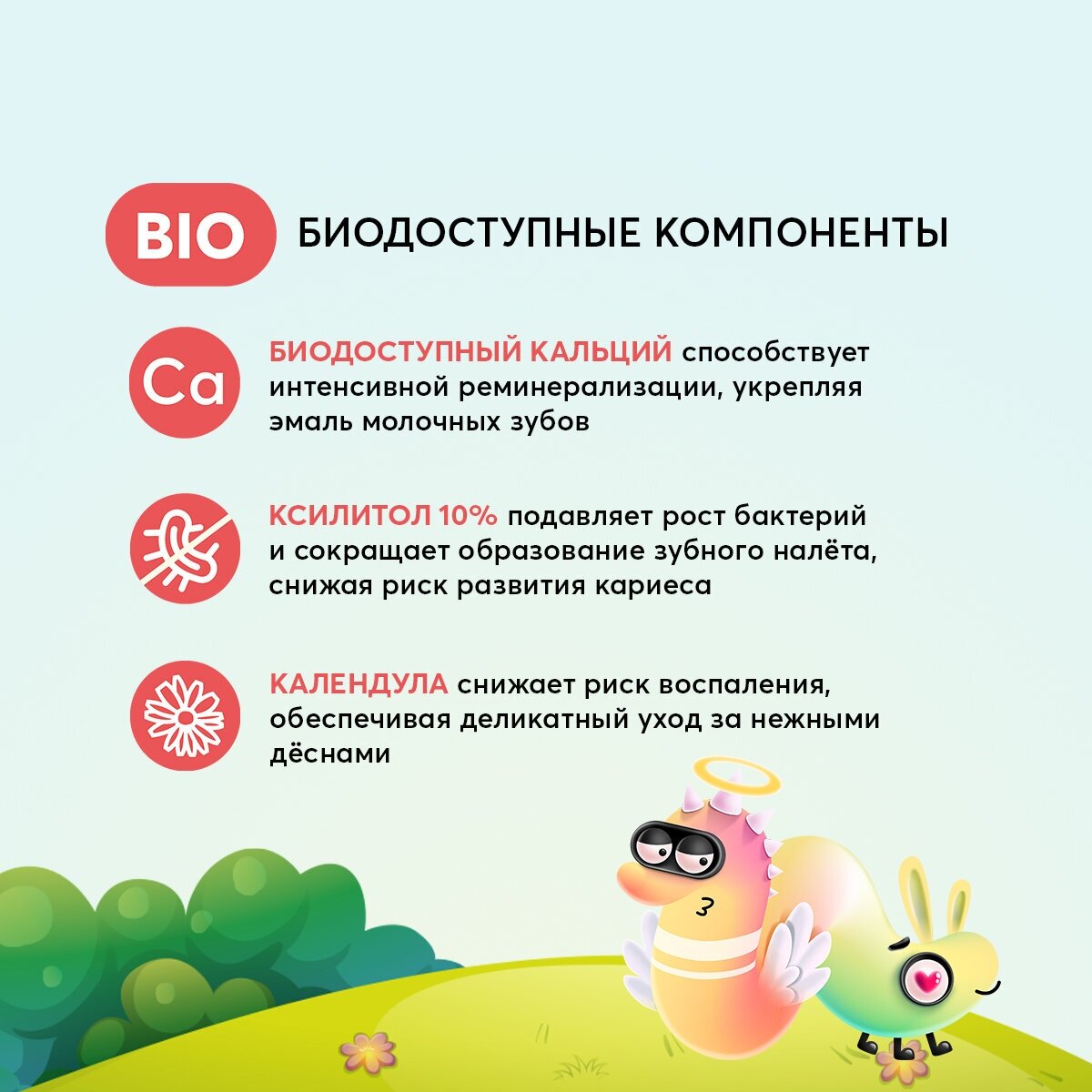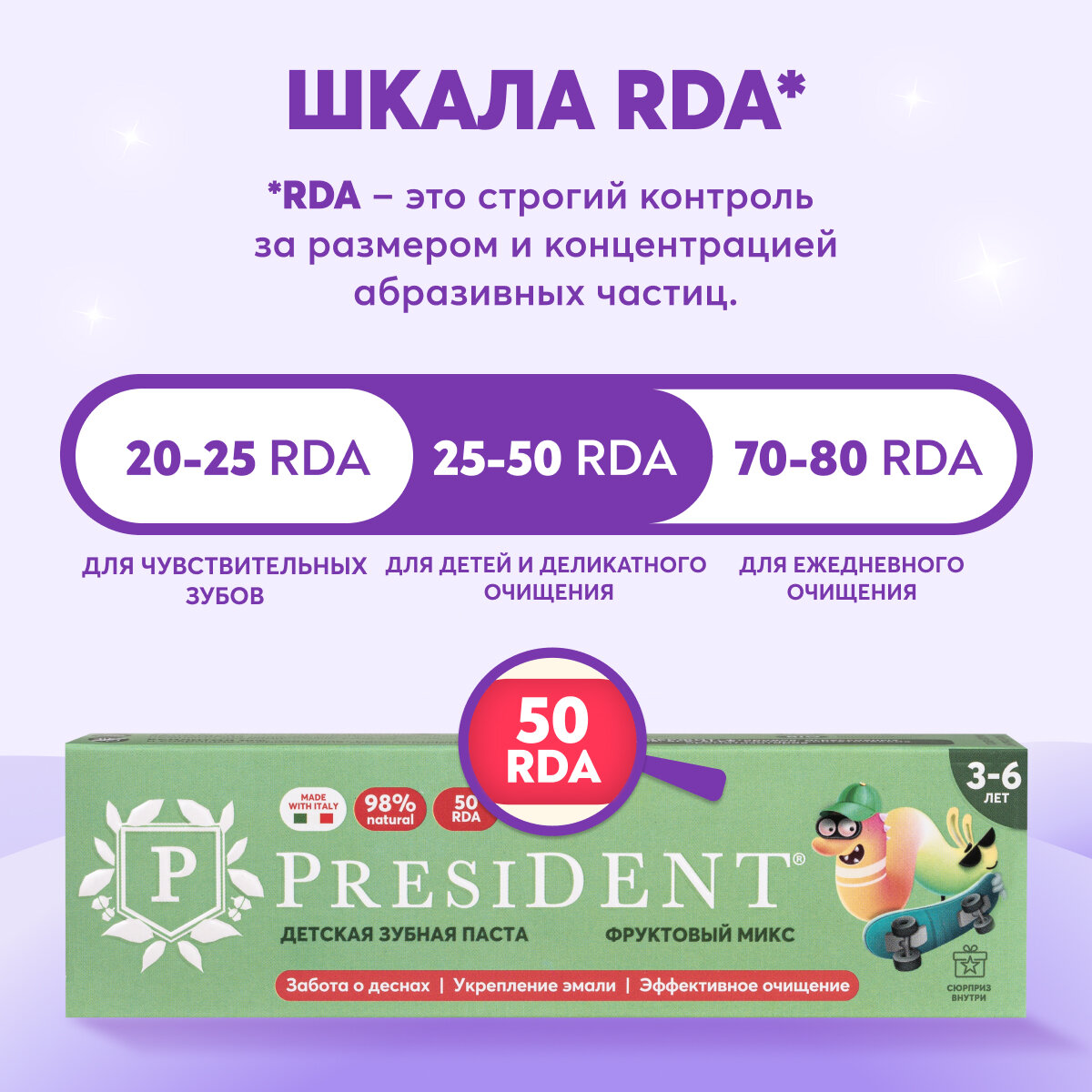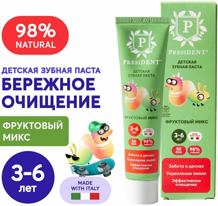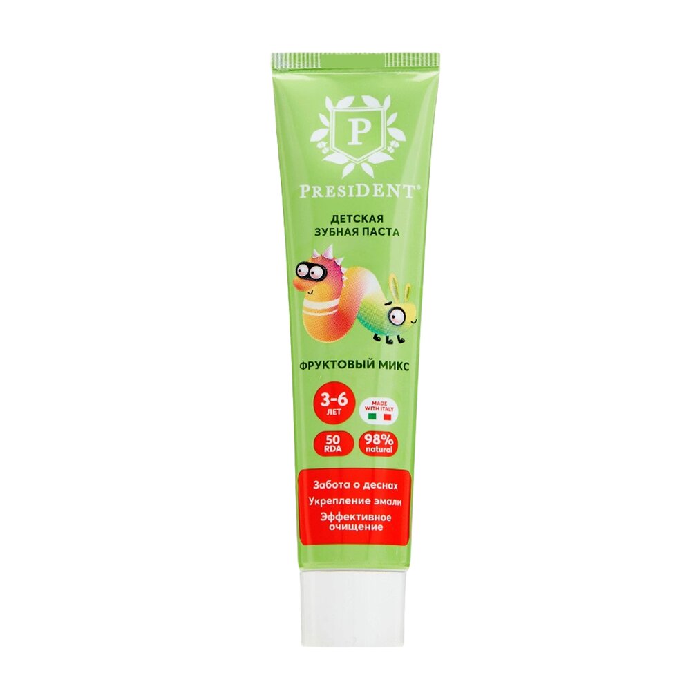 Детская зубная паста PRESIDENT® Фруктовый микс от 3 до 6 лет обеспечивает заботу о деснах, укрепление эмали и эффективное очищение. Безопасно при проглатывании! Гелевая форма зубной пасты облегчает очищение в труднодоступных местах. Эффективность клинически доказана. Одобрено детскими стоматологами. 98% натуральный состав •Биодоступный кальций способствует интенсивной реминерализации, укрепляя эмаль молочных и постоянных зубов •Календула снижает риск воспаления •Ксилитол 10% подавляет рост бактерий и сокращает образование зубного налета НЕ содержит: фторидов, агрессивных абразивов, SLS, SLES, сахара, синтетических ароматизаторов
