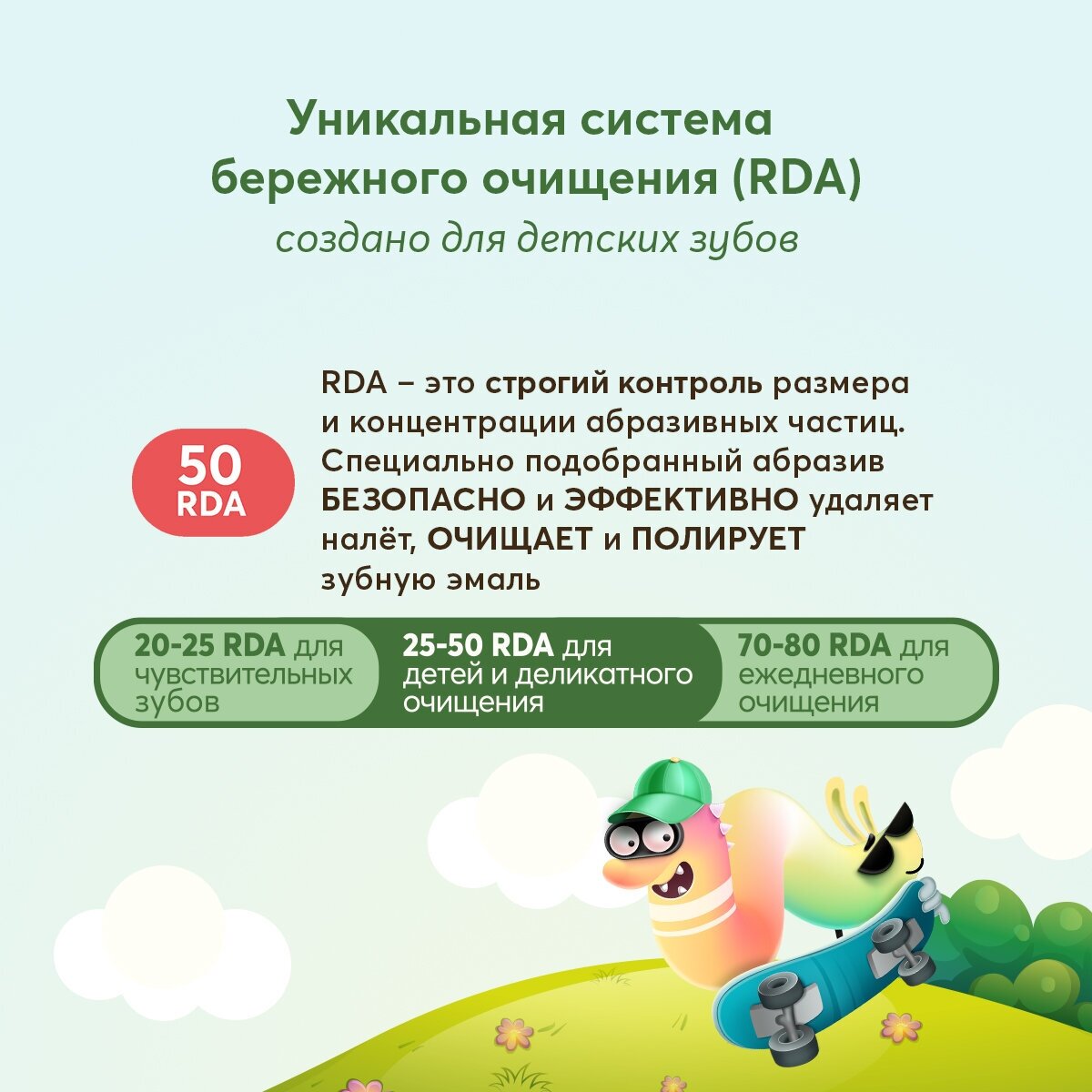 | Меры предосторожности | Дети до 6 лет должны чистить зубы в присутствии взрослых количеством пасты размером с горошину. Не использовать при непереносимости компонентов Контролируемая абразивность (RDA 25) обеспечивает деликатное очищение хрупкой эмали. |