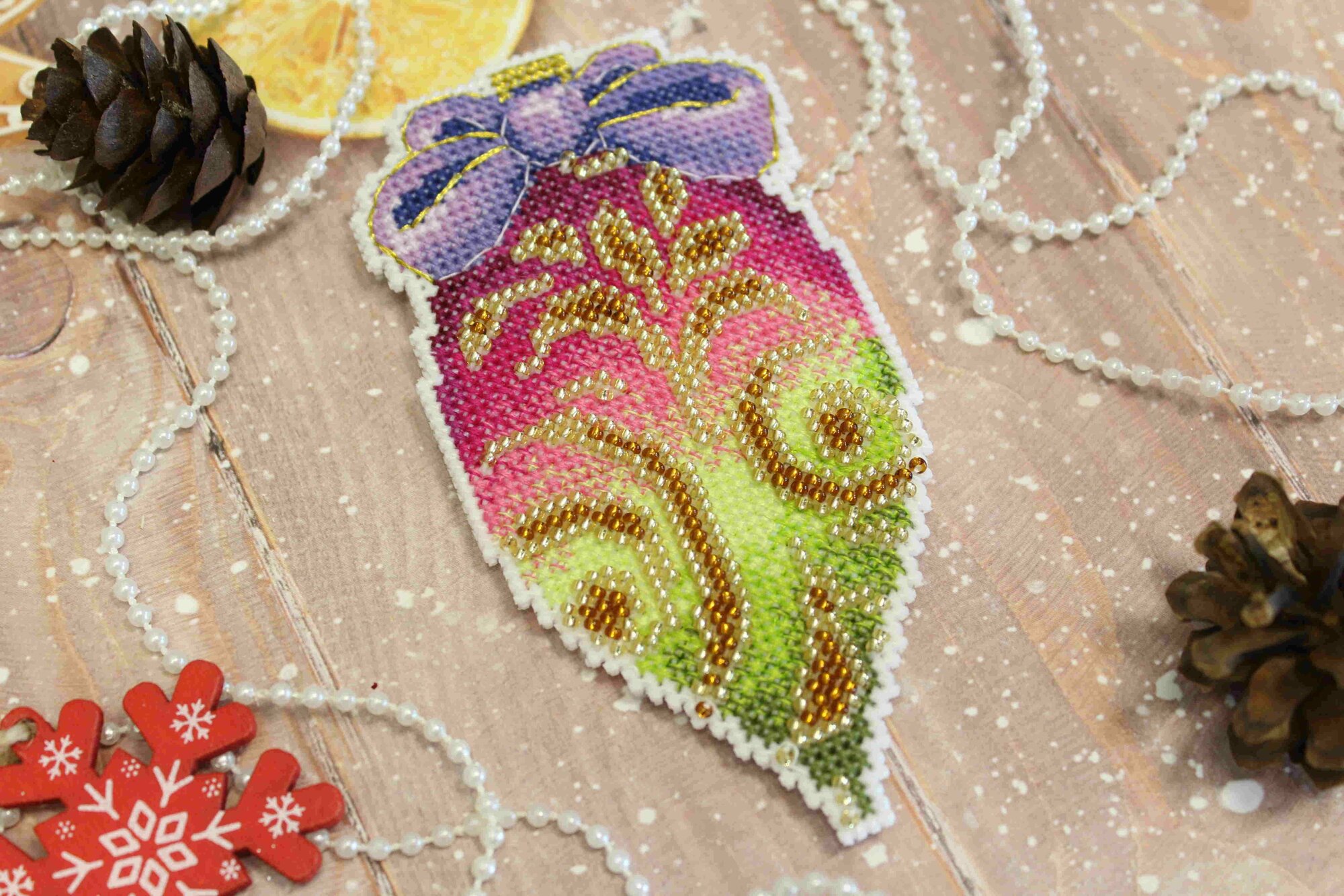 Состав набора:пластиковая канва,нитки мулине ПНК им. Кирова, разобранные на органайзере – 13 цветов (нарезка нити — 1 метр),нитки металлик золото,бисер Preсiosa – 2 цвета,игла,схема.Обе стороны игрушки вышиваются согласно схеме, затем вырезаются по контуру, обозначенному в руководстве по вышиванию, и сшиваются изнаночными сторонами внутрь.Размер готовой работы: 12 х 6 см.