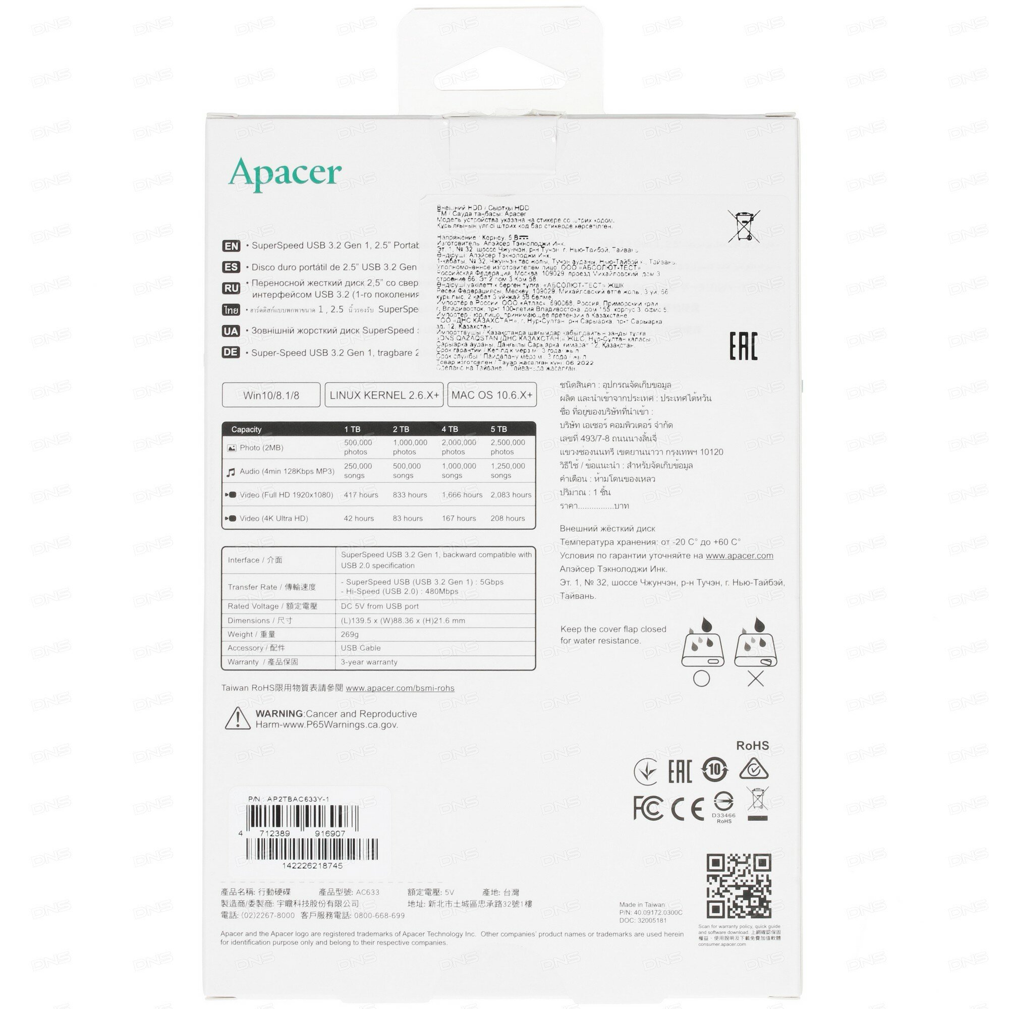 | Прочие особенности и свойства | Внешний HDD Apacer AC633 [AP2TBAC633R-1] - это жесткий диск, обладающий внушительным объемом в 2 ТБ. Такого количества свободного пространства будет вполне достаточно, чтобы все ваши любимые фото, важные документы, фильмы и музыка всегда были у вас под рукой. Главной особенностью этой модели стал ударопрочный корпус, имеющий пыле- и влагозащиту в соответствии со стандартом IP55. Конструкция винчестера предусматривает специальную внутреннюю подвеску, призванную снизить негативные последствия вибрации и ударов при случайных падениях.,Внешний HDD Apacer AC633 [AP2TBAC633R-1] с эффектной красно-черной расцветкой корпуса обладает сравнительно небольшими габаритами - 139.5x88.36x21.6 мм (длина, ширина и толщина соответственно). Вес этой модели также невелик - 269 г. Этот винчестер станет вашим спутником в любой поездке, ведь ему можно найти место в любой сумке или рюкзаке. В качестве интерфейса подключения используется порт USB 3.2 Gen 1 Type A с пропускной способностью 5 Гбит. Представленная в форм-факторе 2.5" модель комплектуется кабелем USB. |