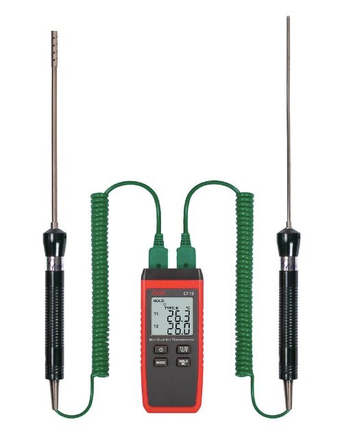 Контактный термометр RGK с поверкой способен измерять температуру от - 40 до + 260 °C. Модель оснащена 2 гнездами для подключения выносных датчиков, которые оснащены функцией определения разности между каналами.