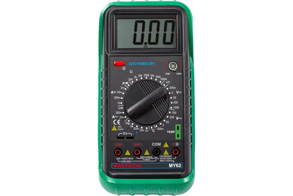 Мульти́метр — электроизмерительный прибор, который включает в себя несколько функций и набор измеряемых параметров. Прибор MY62N относится к обновленной серии N, что отразилось на внешнем и внутреннем дизайне, ряде параметров и улучшенной схемотехнике, добавлена функция памяти данных на экране. Прибор измеряет постоянное и переменное напряжение, а также постоянный и переменный ток, сопротивление, емкость в цепи и даже температуру. С помощью данного прибора можно проводить тестирование диодов, прозвонку целостности цепи и измерение коэффициента усиления транзисторов. Таким образом, один прибор сможем заменить сразу несколько устройств одновременно.