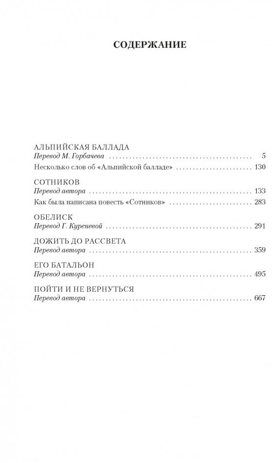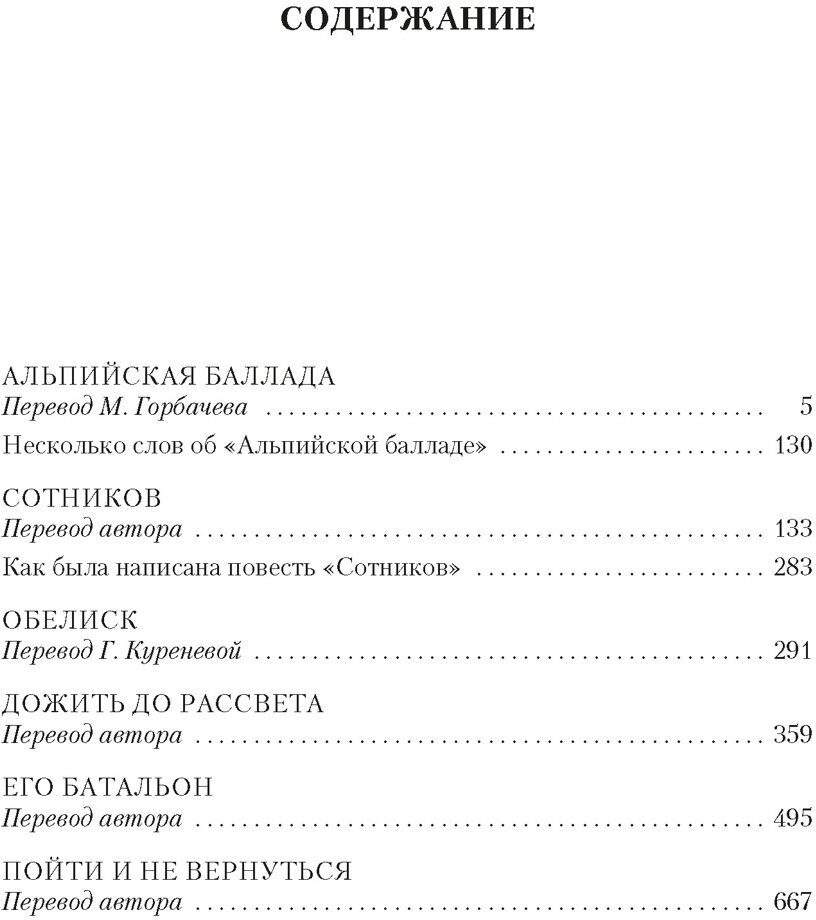 В книге собраны все самые известные повести, разные по содержанию, но единые по духу, по теме и по смыслу повествования. Очень правдиво и достоверно изображается великая отечественная война. Словам автора веришь, такое ощущение как будто сам, вместе с автором, в описанные ситуации попал. Читателю самому предстоит сделать выбор, представить, что бы он сделал, если бы на месте описанных литературных героев был. Непростой выбор. Причём размышляешь не только о главных героях, но вообще обо всех описанных личностях и ситуациях. Думаешь, кто из героев в какую именно сторону шагнёт, и сам реально за них переживаешь, словно предчуствуя что кто-то из них сделает первый шаг в сторону предательства, а кто-то поступит наоборот. Очень сильное впечатление от прочитанного, очень запоминающиеся герои всех повестей. Автор как тонкий психолог, показывает человеческую сущность со всех сторон. В своё время эти повести нам задавали прочитать в школе, очень теперь жалею, что тогда не прочитал.