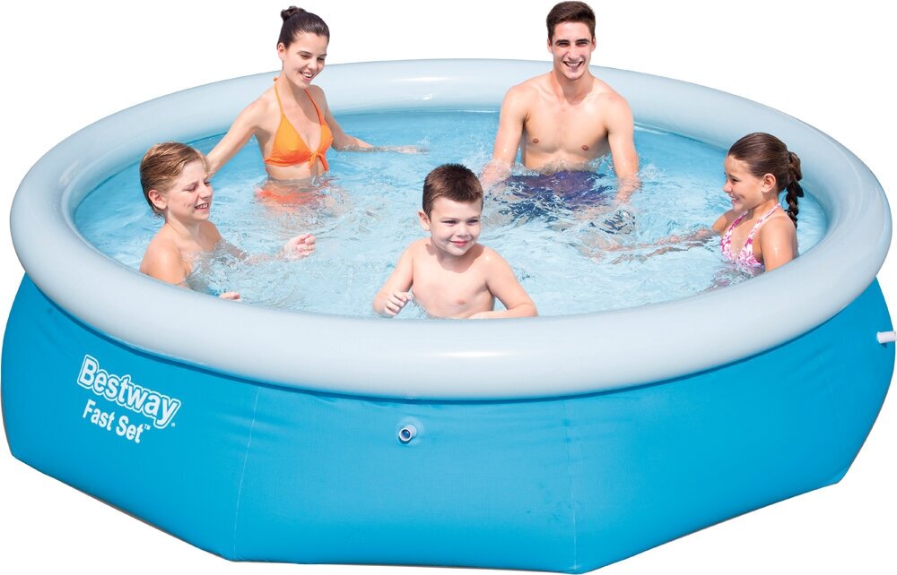 Надувной бассейн Bestway 57266/57009 Fast Set отличается простотой и легкостью. Стенки бассейна, выполнены из армированного ПВХ, внешний слой - полиэстер для особой прочности. Поддержка бортов осуществляется при помощи надувного кольца, которое поднимается по мере наполнения бассейна и расправляет его стенки. Для установки бассейна нужна плоская, горизонтальная площадка. Время сборки и подключения бассейна не более 10-15 минут. На холодное время года не рекомендуем оставлять бассейн на открытом воздухе. Удобный сливной клапан позволяет присоединить садовый шланг, что дает возможность слить воду в любое место.