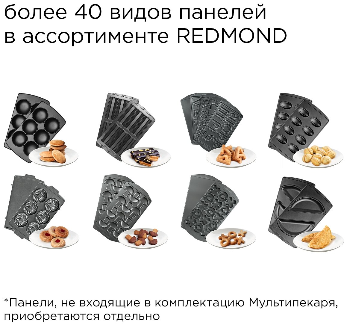 В комплектацию RMB-603 входит три вида панелей для выпечки и запекания: 1. RAMB-01 («Сэндвич») – готовьте сытные сэндвичи с ветчиной и сыром, сладкие с бананом и шоколадом или запекайте на этих же панелях оладьи, жарьте драники. 2. RAMB-02 («Венские вафли») – помимо классических венских вафель на этих панелях вы сможете выпекать множество других: лимонные, банановые, шоколадные, сырные, творожные, несладкие закусочные вафли. 3. RAMB-18 («Орешки») – для любимых сладких орешков с начинкой: вареной сгущенкой, сливочным кремом, джемом, шоколадной пастой.