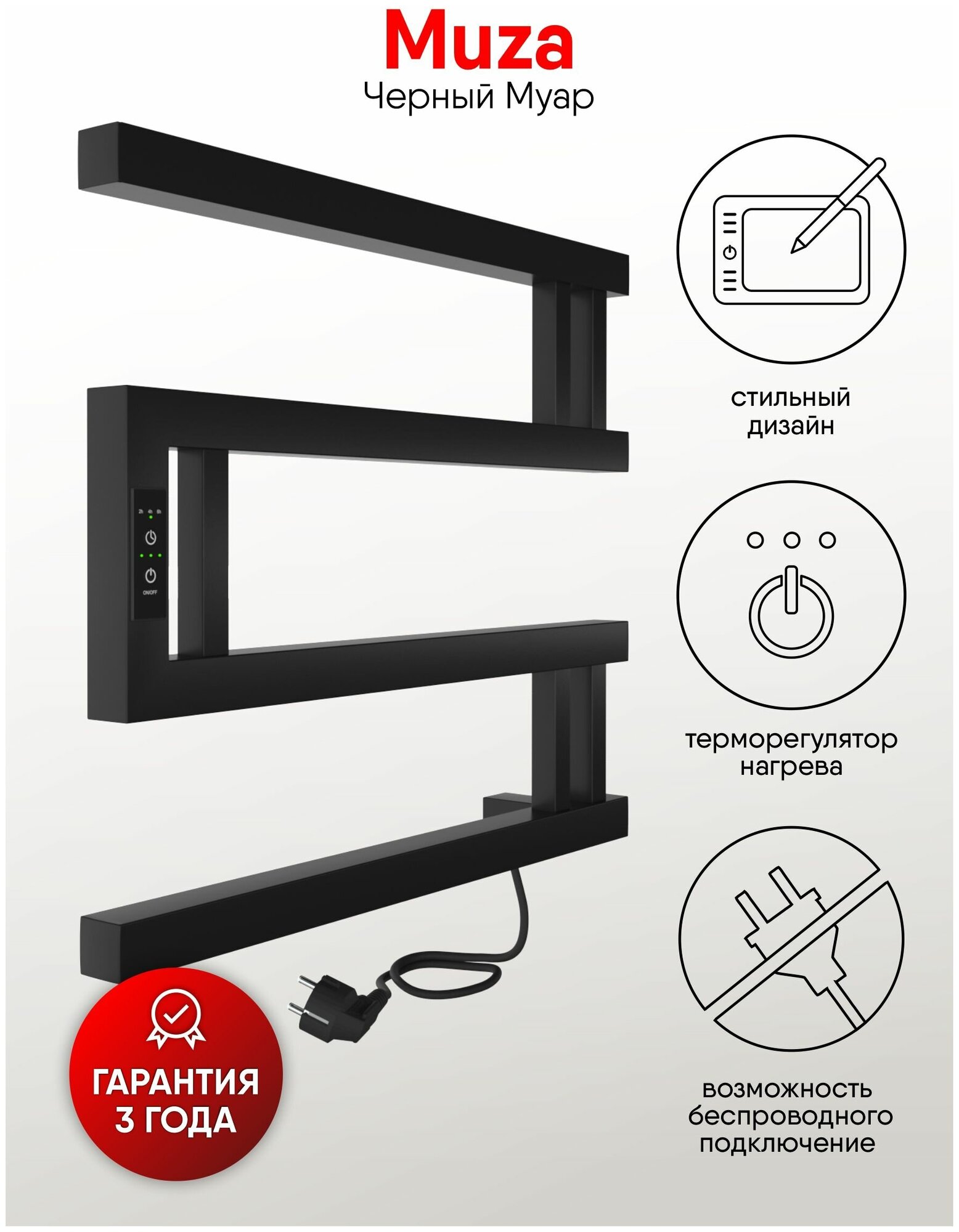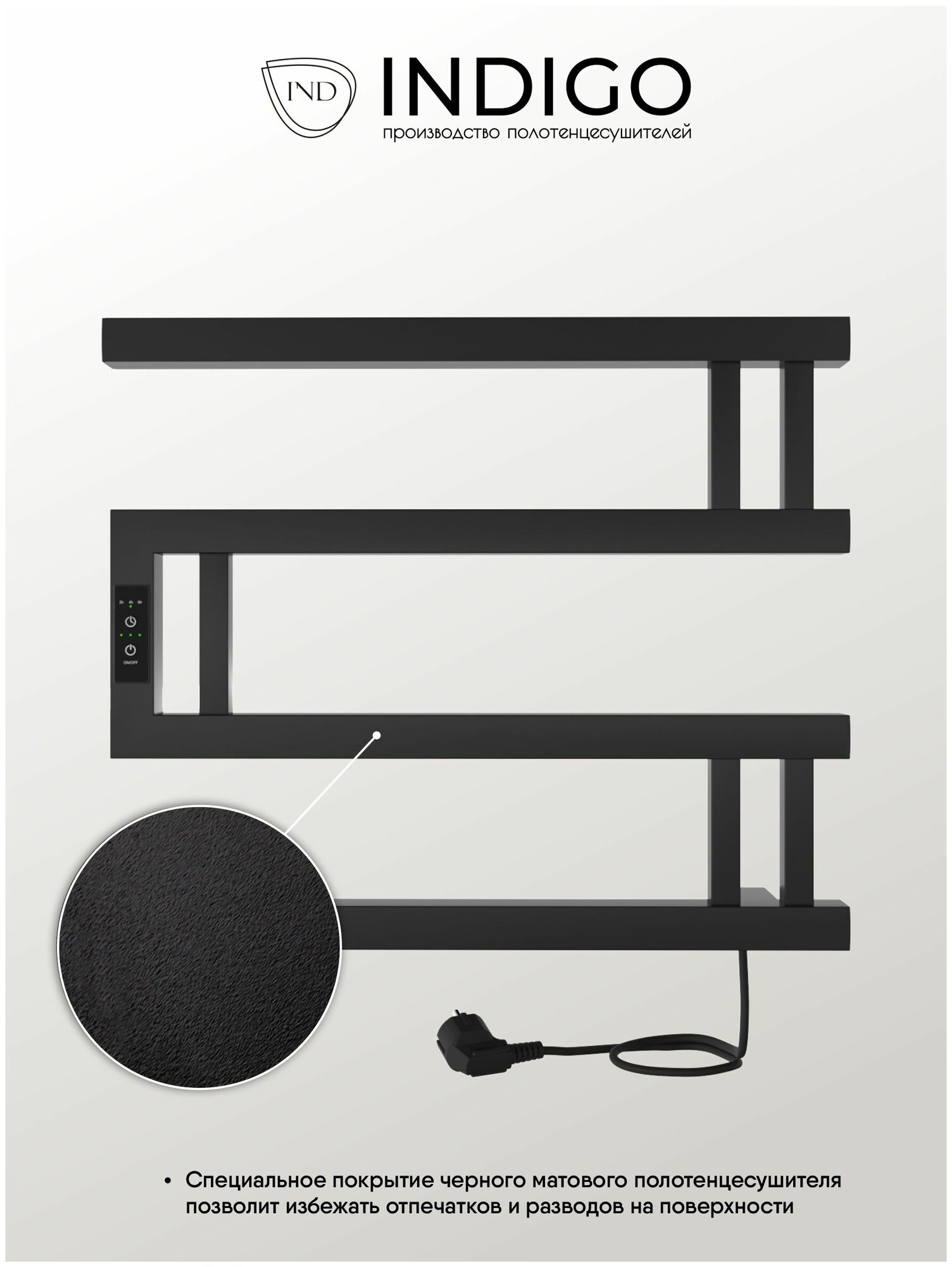 Полотенцесушитель электрический INDIGO Muza в размере 400х500 (ВхШ) выбирают за его технологичность и форму. Модель имеет терморегулятор нагрева, у которого три режима: 40, 45, 50 градусов и таймер на отключение через 2, 4, 6 часов. Универсальность изделия предусматривает подключение через прямой провод или скрытое подключение без покупки дополнительного переходника. Длина прямого провода 1,2 метра. Изделие окрашено порошковой краской по специальной технологии. Полотенцесушитель относится к энергоэффективным изделиям, потребляемая мощность в данном размере 64 Вт. Специальная технология нагревательного кабеля защищает полотенцесушитель от перегрева, что влияет на длительные сроки службы. В комплектации идут 3 телескопических держателя, комплект монтажа и гарантийный паспорт. Полотенцесушитель INDIGO Muza застрахован и имеет гарантию 3 года. Выбирая INDIGO вы получаете надежный продукт с гарантией качества от Российского производителя