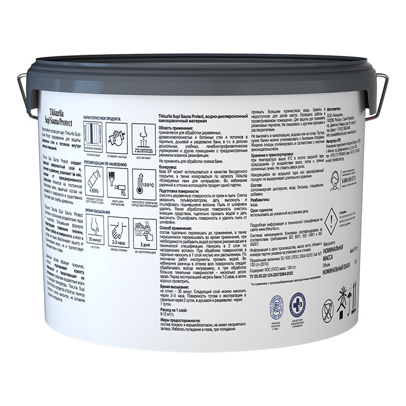Термостойкий состав для сауны. Защитный прозрачный состав для деревянных стен и потолков внутри влажных помещений.Предназначен для обработки деревянных, древесноволокнистых и бетонных стен и потолков внутри влажных помещений, в т.ч. в детских дошкольных, учебных, лечебно-профилактических учреждениях и других помещениях с предусмотренным режимом влажной дезинфекции. Применяется для обработки стен и потолков в парильне, душевой и раздевалке бани. Не применять для обработки полков бани. Метод нанесения: наносится кистью или распылением. Количество слоев: 1-2 слоя Время высыхания между 2 слоями: через 2-3 часа Время полного высыхания: через 2-3 часа Температура при нанесении:Температура воздуха должна быть не ниже 5°С