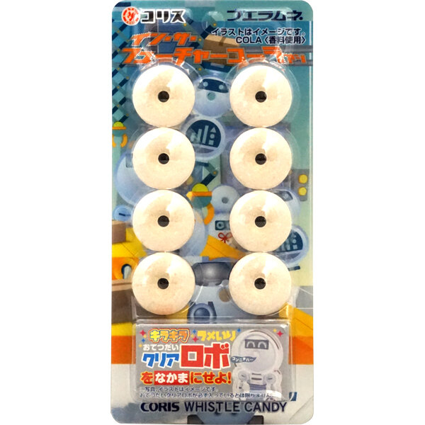Вкусные конфеты в форме колечек. Упаковка привлекает и поражает воображение. Даже без иероглифов сувствуется – вкусняшка прямиком из Японии. Если вставить это конфету в рот и дунуть, она издаст мелодичный свист. По-крайней мере, должна. Если её сначала разжевать, то чуда, что вполне закономерно, не произойдёт. Вкус колы, знакомий многим с детства.