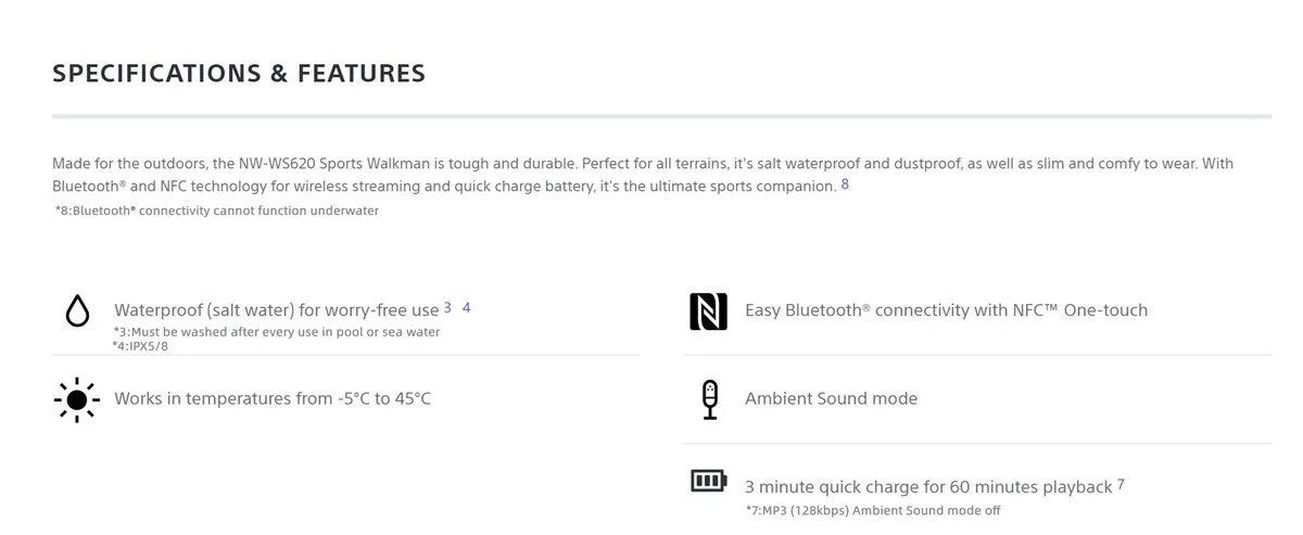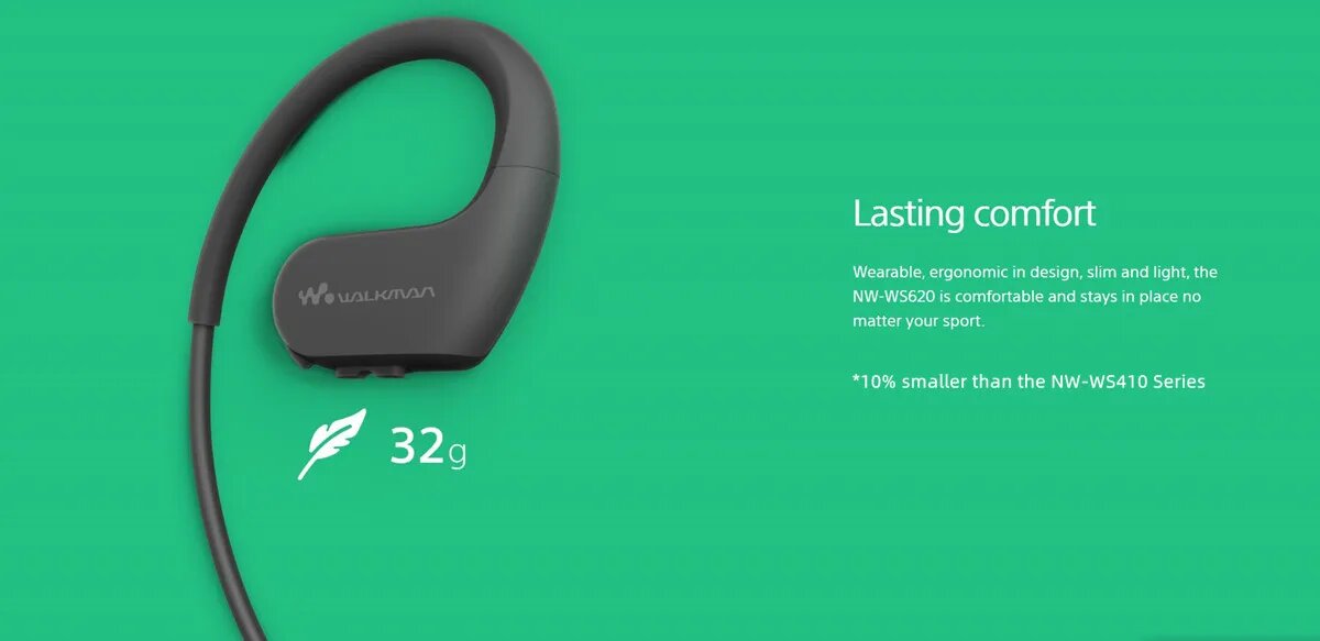 Наушники Sony NW-WS623 синхронизируются со смартфоном одним прикосновением, поскольку снабжены беспроводным модулем Bluetooth/NFC. Их встроенный аккумулятор рассчитан на 12 часов непрерывного прослушивания музыки без перезарядки. Кроме того, пользователь может отправляться на прогулку и пробежку без смартфона – устройство оснащено встроенным медиаплеером с собственным накопителем информации, способным воспроизводить аудиофайлы большинства популярных форматов, включая FLAC и Linear PCM.