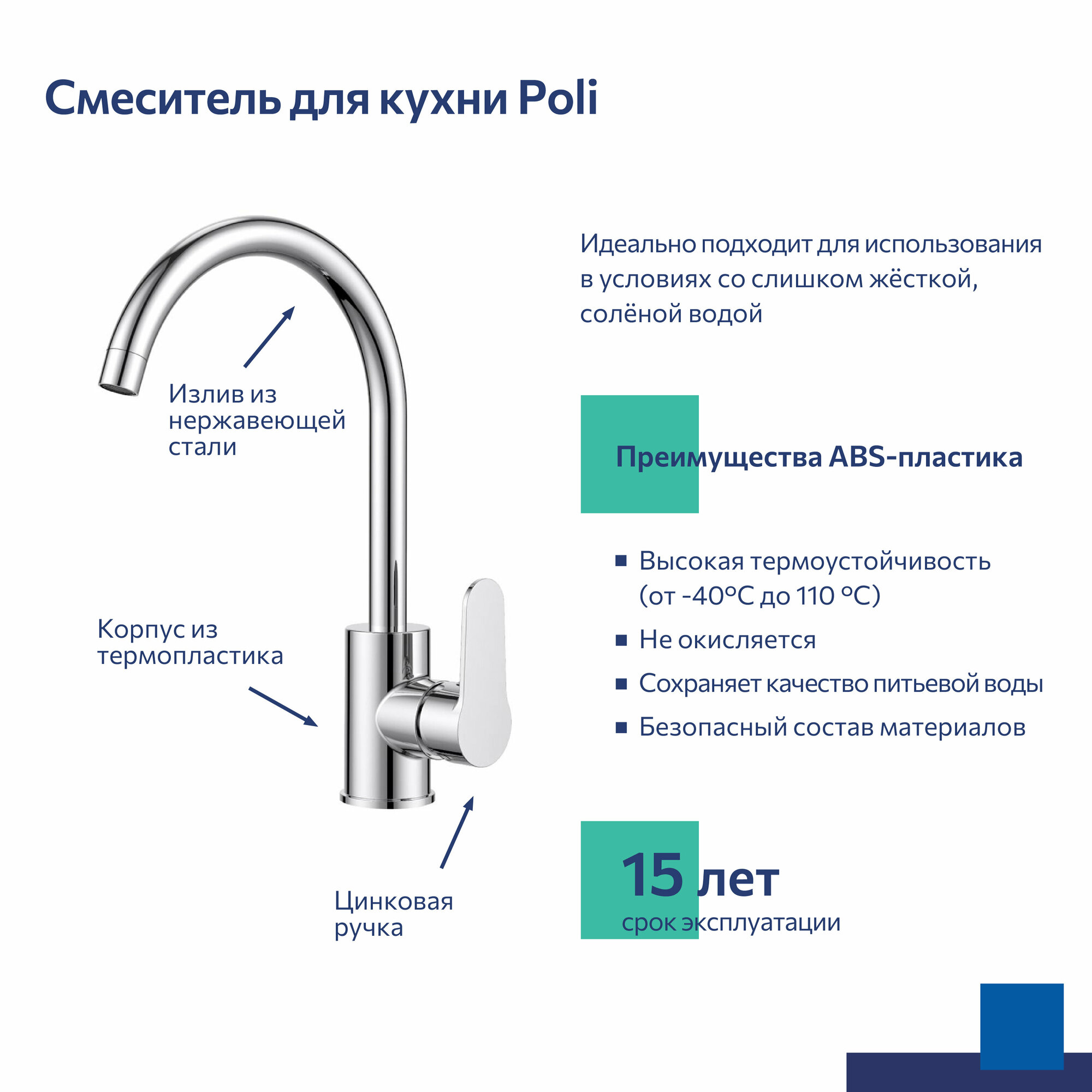 Коллекция Poli создана под проекты современных интерьеров. Плавная форма излива этой модели лучше всего подойдет к мойкам овальных и круглых форм. Корпус смесителя Poli выполнен из современного полимерного сплава. Отличить такой смеситель для кухни легко по небольшому весу. А вот найти разницу в эксплуатационных характеристиках под силу только эксперту. Материал экологичен, не разрушается под воздействием хлора и солей. Пластик обладает высокой термоустойчивостью и не нагревается при эксплуатации – даже самые маленькие члены семьи надежно защищены от случайных ожогов. Гибкая подводка и крепеж идут в комплекте. • Качественный механизм смешивания воды смесителя Milardo рассчитан на более чем 70 000 циклов работы – это не менее 15 лет эксплуатации семьей из трех человек. • Оптимальная толщина никель-хромового покрытия защищает смеситель от образования трещин и сколов, продлевает срок его службы. • Гарантия на смеситель для раковины Milardo – 5 лет, на картридж – 3 года.