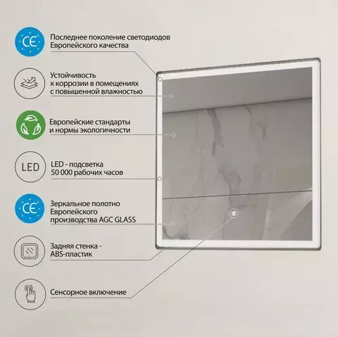 Зеркало со светодиодной подсветкой и сенсорным управлением. Размер зеркала: Ш700хГ32хВ700 мм. Вес: 8,6 кг. Размер зеркала в упаковке: Ш750хГ45хВ750 мм. Вес с упаковкой: 8,8 кг.Форма зеркала: прямоугольное. Тип крепления: подвесное. Материалы: зеркальное полотно европейского производства AGC GLASS, корпус ABS-пластик. Устойчивость к коррозии в помещениях с повышенной влажностью.Комплектация: светодиодная подсветка (последнее поколение светодиодов европейского качества), сенсорный включатель, набор шурупов и дюбелей для подвешивания зеркала, инструкция по эксплуатации, упаковка.Мощность лампы: 20W. Гарантия 2 года.Страна-производитель: Россия.Зеркало 0 - это максимально совершенное исполнение внешнего вида и улучшенные технические характеристики.Geometry Classic создано для комфортной динамичной жизни!