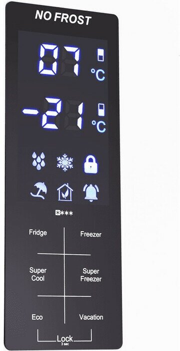 | Индикация | температуры, открытой двери, повышения температуры, блокировки от детей, режима «Отпуск», быстрой заморозки, быстрого охлаждения, режима «ECO» |