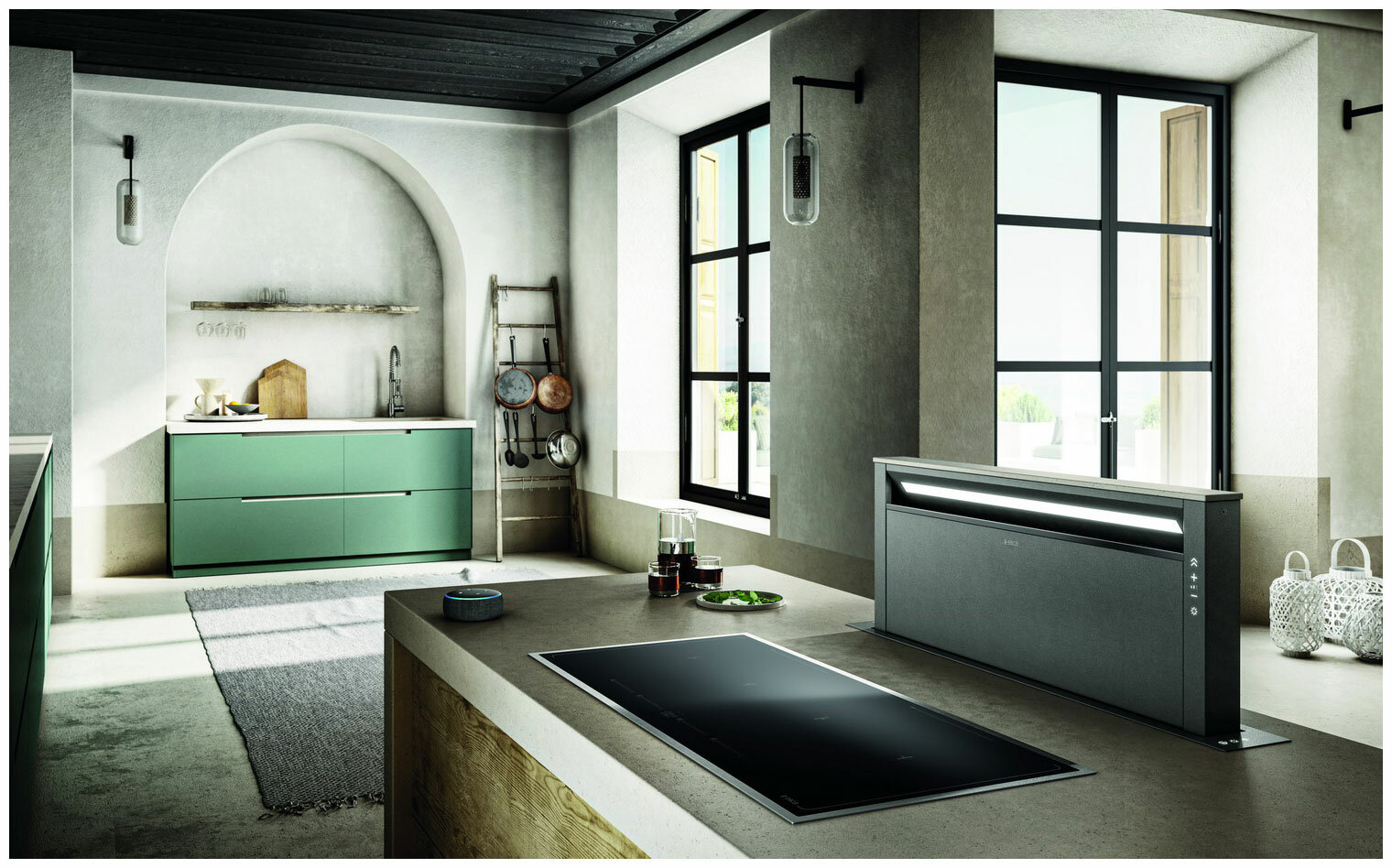 Вытяжкой очень довольна. Выбрали такую, потому что хотели оставить над островом открытое пространство. У вытяжки есть подсветка. Очень удобно готовить в пасмурную погоду или когда вечереет. Мне нравится, что вытяжка задвигается в столешницу. Со своей задачей прекрасно справляется. Работает тихо. Можно управлять через приложение.