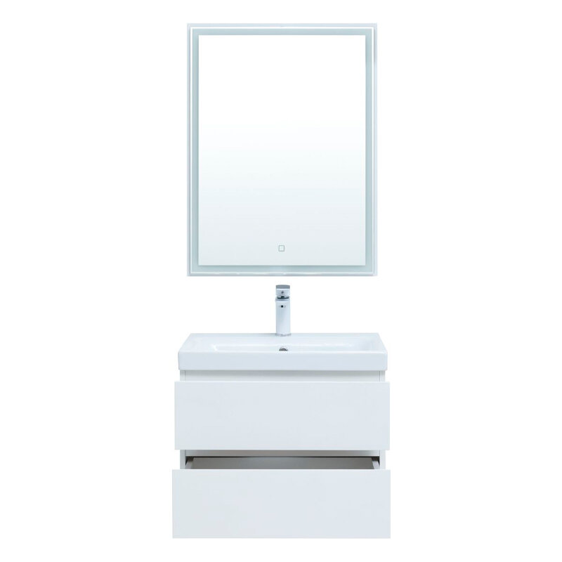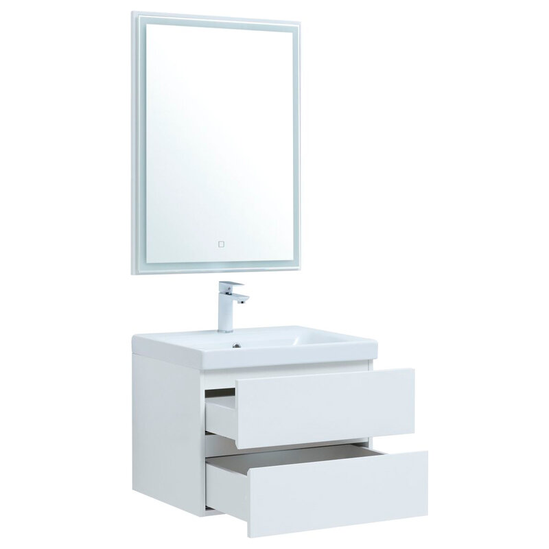 Комплект мебели для ванной Aquanet Беркли 00306358. Беркли 60 белый глянец имеет изюминку-контрастную декоративную полосу между ящиками в цвете белый глянец. Корпус и фасады тумбы выполнены из влагостойкого ЛДСП и покрыты глянцевой белой эмалью. В конструкции тумбы использованы интегрированные ручки без острых краев и внутренних углов. И еще одно важное преимущество: функциональная зона хранения в тумбе шириной 60 см. Она распределена между двумя выдвижными ящиками. Их внутренняя часть выполнена в белом цвете. Верхний ящик это органайзер, разделенный на три отделения, где удобно хранить мелочи. Нижний более глубокий и позволит сложить полотенца или поставить весь арсенал моющих или гигиенических средств. Ящики оборудованы доводчиками