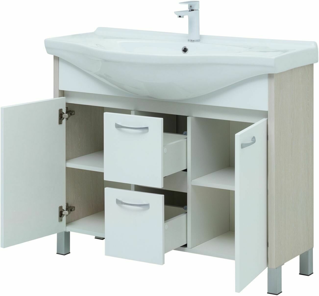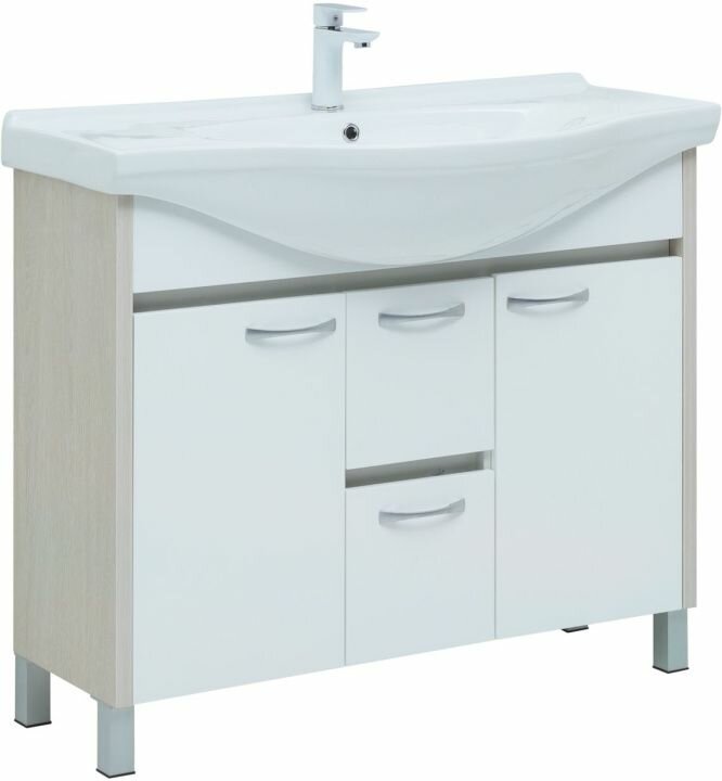 Тумба под раковину Aquanet Донна 98 00274164. Тумба под раковину в ванную комнату бренда Aquanet выполнена в стиле стандарт и входит в нашу коллекцию мебели Донна. Представленная коллекция мебели для ванных комнат осчастливила сотни покупателей, так как они приобрели сочетание дизайна, качества и функциональности. Важный момент при выборе тумбы для раковины - это материалы. Они должны быть адаптированы к эксплуатации в условиях повышенной влажности. Влагостойкий ЛДСП - материал, из которого выполнен корпус изделия, фасад - из влагостойкого ЛДСП. При монтаже напольной тумбы в первую очередь необходимо учесть ширину, которая равна 98 см. Тумба в цвете светлое дерево (белый/белый дуб) освежит Вашу ванну и будет отлично сочетатся с сантехникой. Тумба в ванную также обеспечит вам экономию места, так как в ней предусмотрены полки, куда можно поместить средства личной гигиены