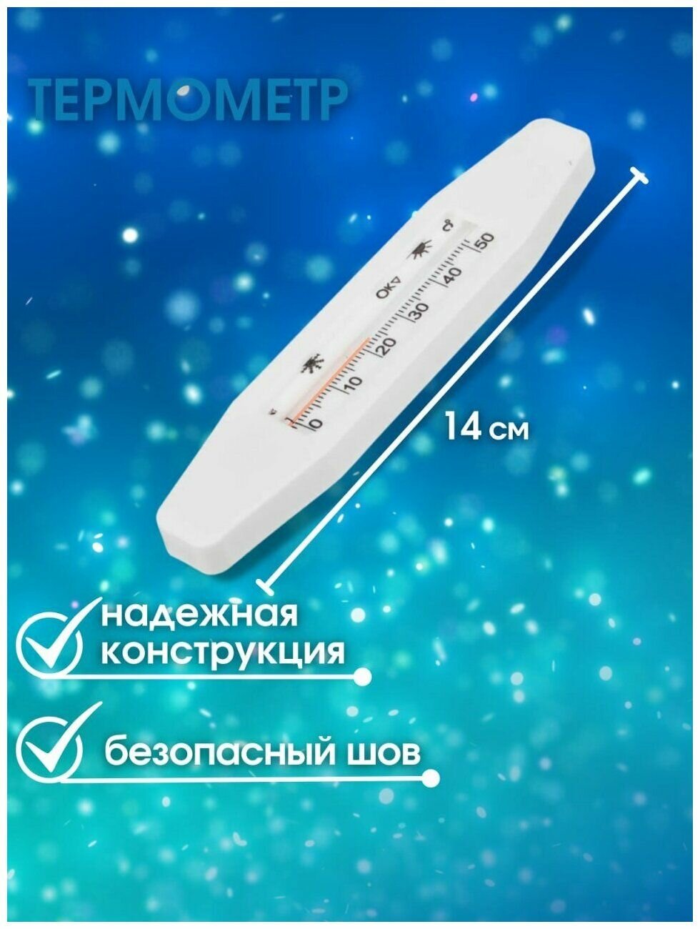 Термометр используется для измерения температуры воды, не содержит ртути. Удобная шкала поможет определить оптимальную температуру для купания.