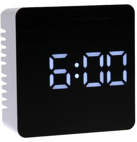 Часы электронные светодиодные с будильником, дисплей с зеркальной поверхностью, белая светодиодная подсветка, 2 уровня яркости, выбор часового формата 12/24 часа, будильник с функцией автоповтора (каждые 5-60 мин.), питание через USB-кабель (в комплекте)