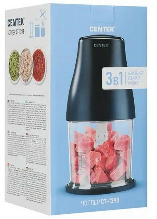 Чоппер-измельчитель Centek - это компактный и удобный прибор для измельчения и взбивания продуктов. Он имеет мощность 400 Вт, две скорости работы и чашу объемом 800 мл. В комплекте идут три насадки, которые позволяют измельчать, взбивать и чистить продукты.Чоппер Centek выполнен в стильном черном цвете и имеет современный дизайн. Он легко моется и не занимает много места на кухне. Чоппер оснащен универсальным ножом и насадкой для нарезки ломтиками, что делает его универсальным прибором для приготовления блюд.Крышка плотно прилегает к чаше, что исключает разбрызгивание продуктов в процессе измельчения, а прорезиненные ножки обеспечивают устойчивость прибора на столе.Преимущества чоппера-измельчителя Centek:- Высокая мощность и две скорости работы;- Компактный размер и стильный дизайн;- Универсальность использования;- Прорезиненные ножки для устойчивости;- Легкость мытья;- Три насадки в комплекте.Способ применения:1. Подготовьте продукты для измельчения;2. Вставьте чашу в корпус чоппера;3. Установите насадку для измельчения или взбивания;4. Закройте крышку и включите прибор в сеть;5. Выберите необходимую скорость работы;6. Измельчайте продукты до нужной консистенции.Если вы ищете удобный и компактный прибор для измельчения продуктов, то чоппер-измельчитель Centek - это идеальный выбор для вас. Он прост в использовании и имеет множество преимуществ, которые помогут вам приготовить вкусные и полезные блюда.